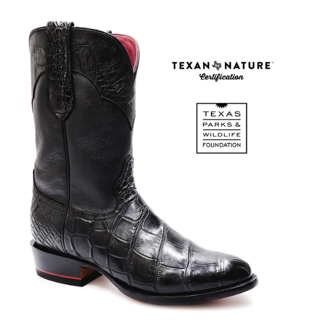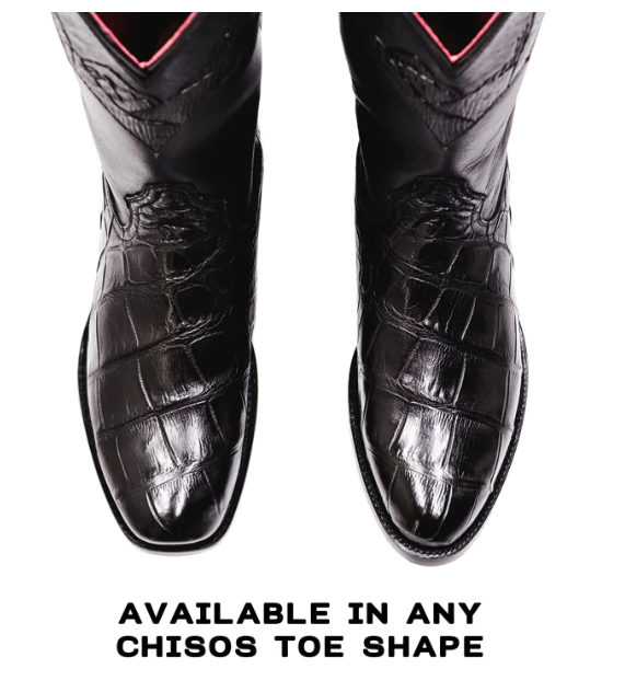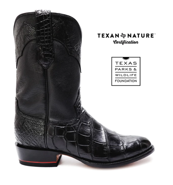 Each pair is mirror-cut from distinctive royal black alligator, caught in Southeast Texas, and crafted to your boot size and preferred toe shape.