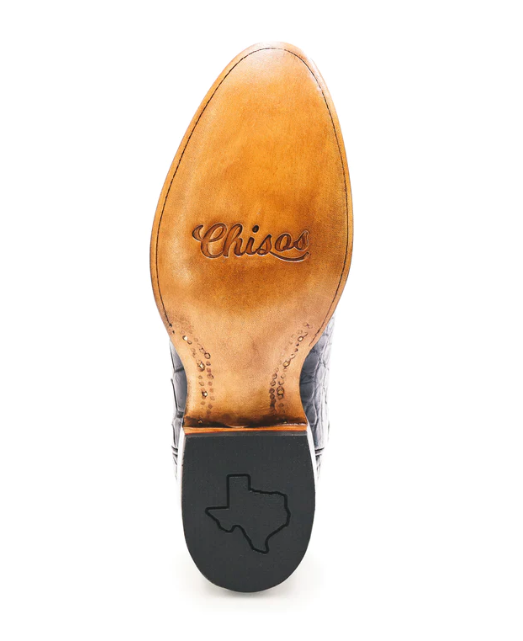 A hand-carved relief of the Chisos Mountains forms the collar, built upon Chisos heritage cowhide uppers. Gator pulls complement either side.