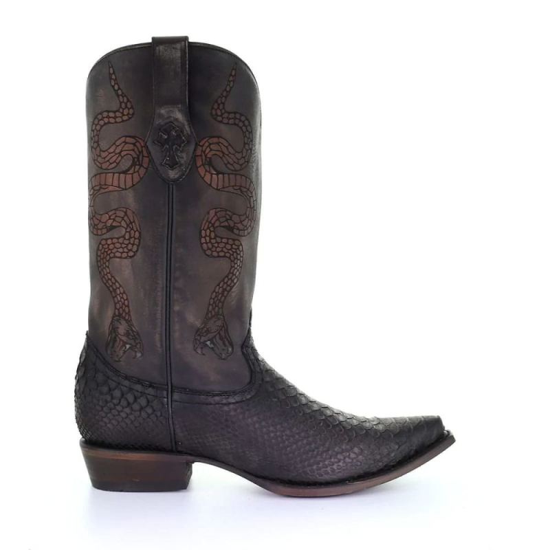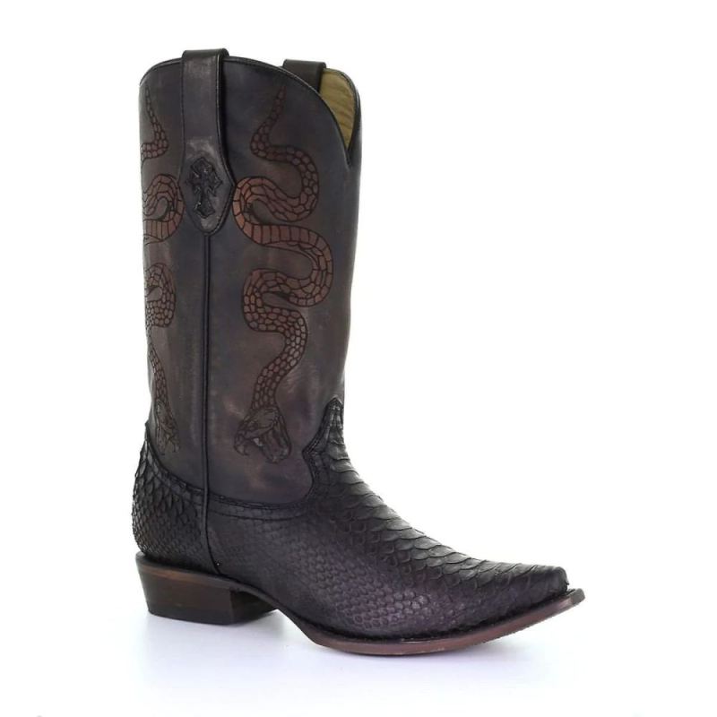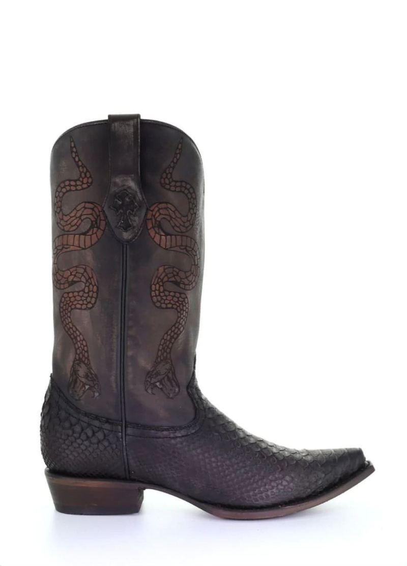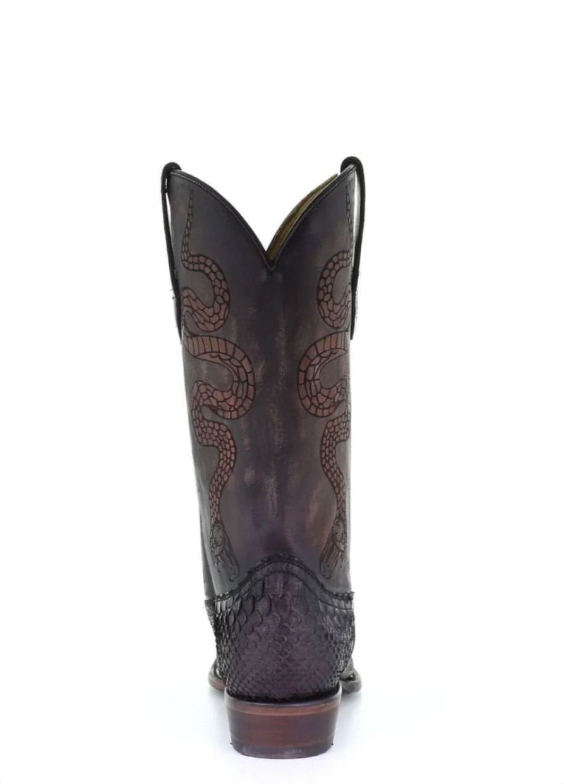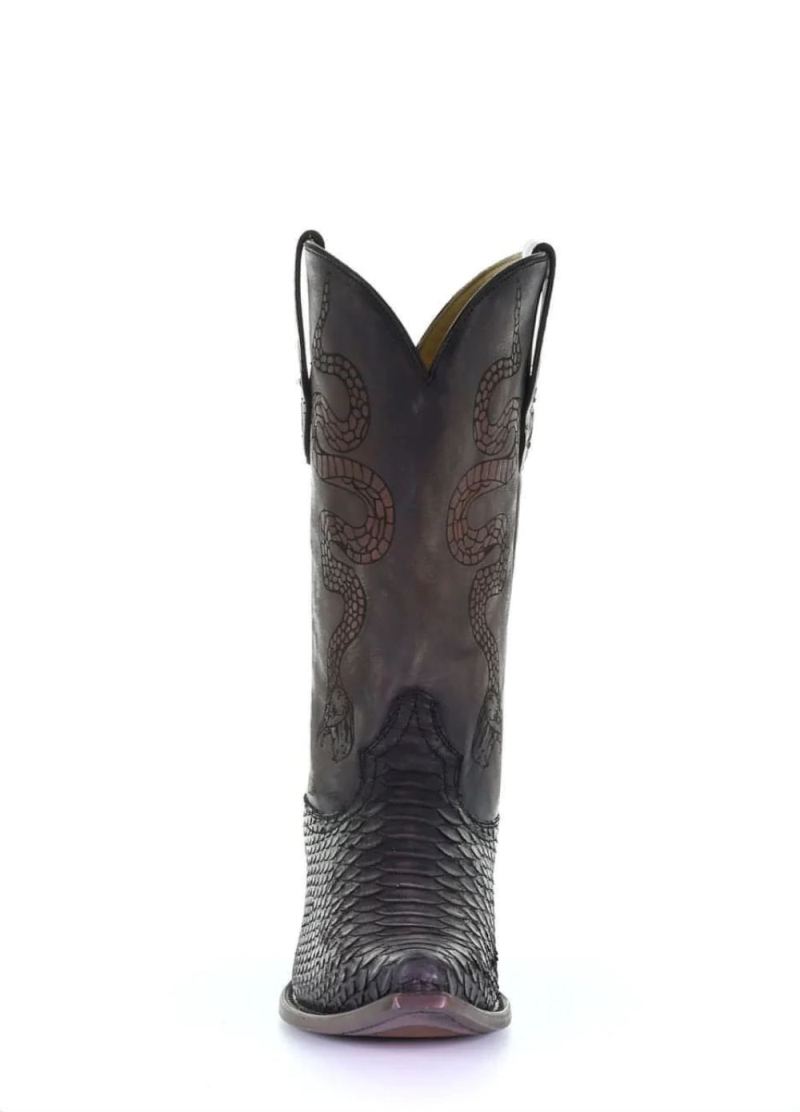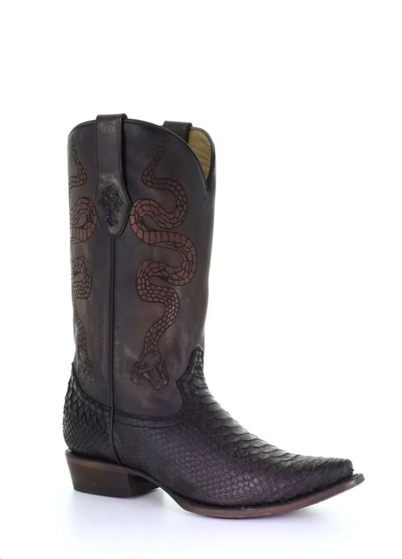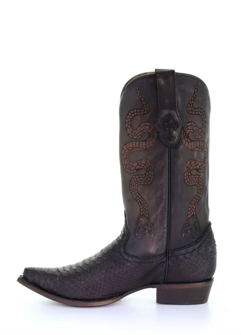 Men's Black Python Hand Painted & Laser Engraved Snake -A smooth black python vamp is the base for a python snake to slither its way down the shaft of the boot.
