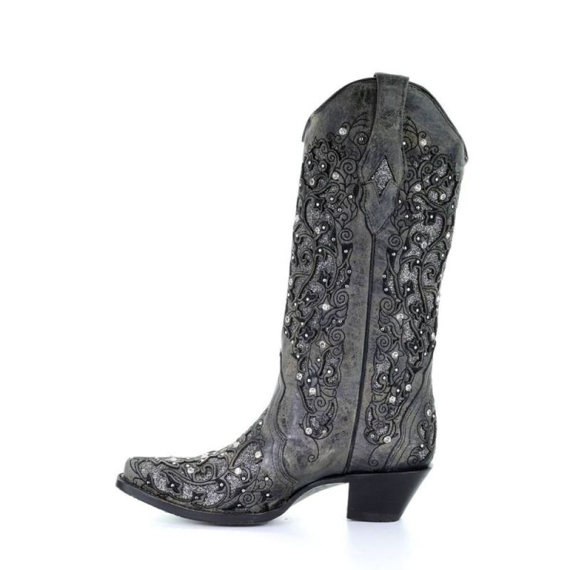 Grey Glitter Inlay and Crystals - Made with an original cowhide leather overlaying an iridescent glitter. This boot is finished with crystal accents making it perfect for your big day or any special event where you want to shine.