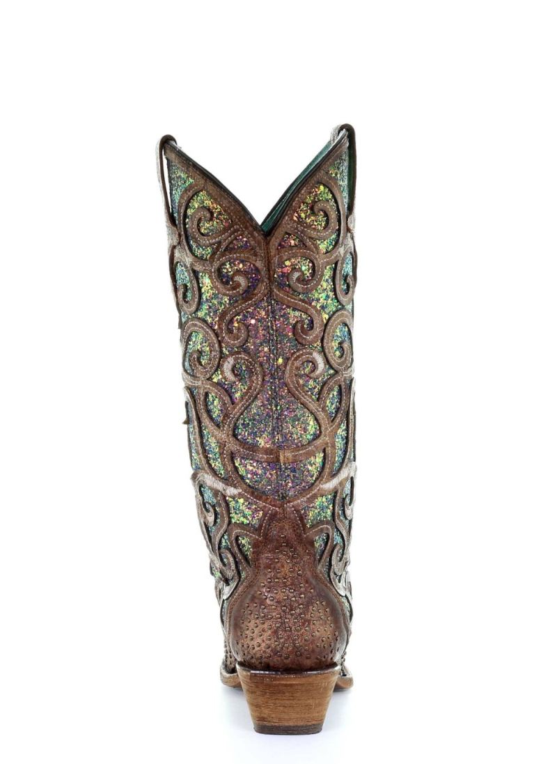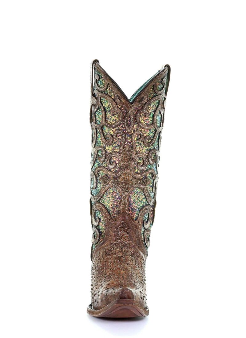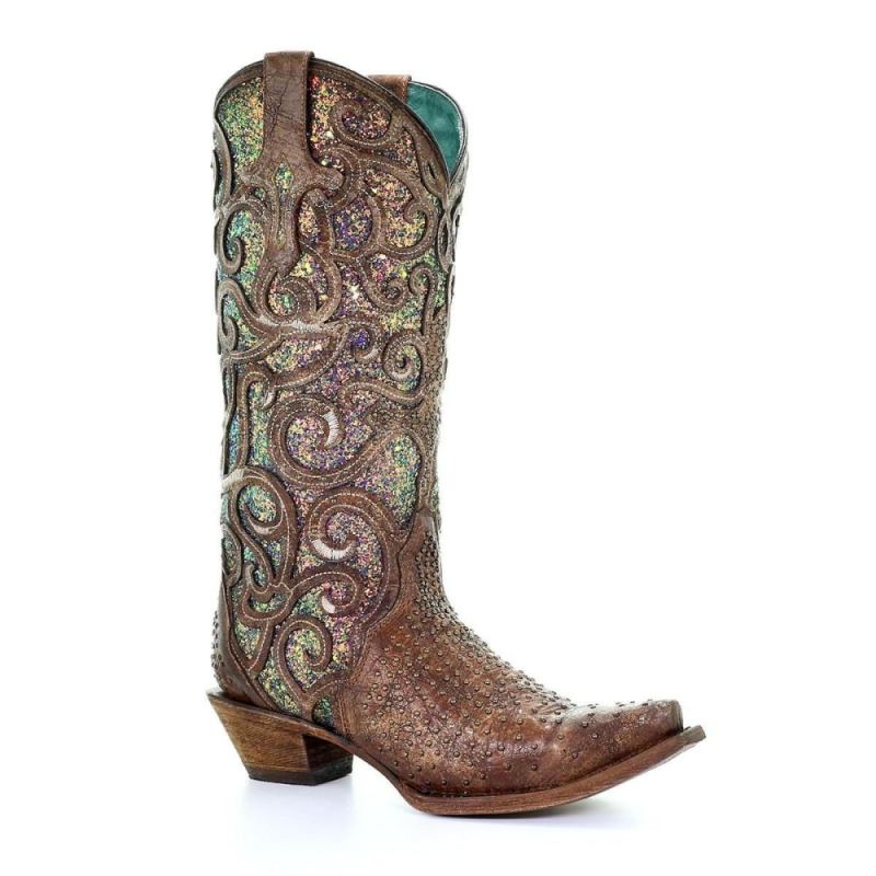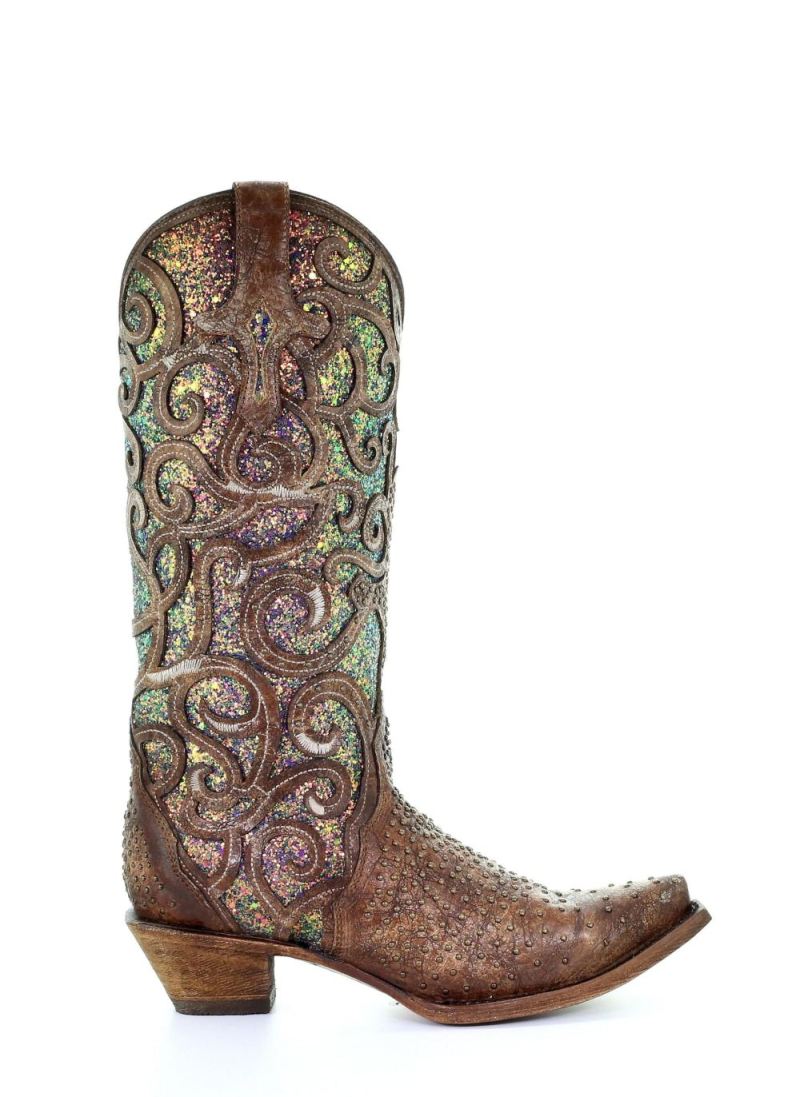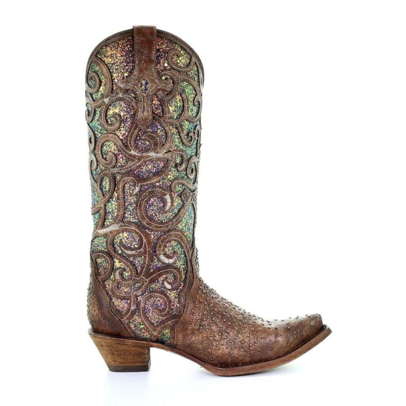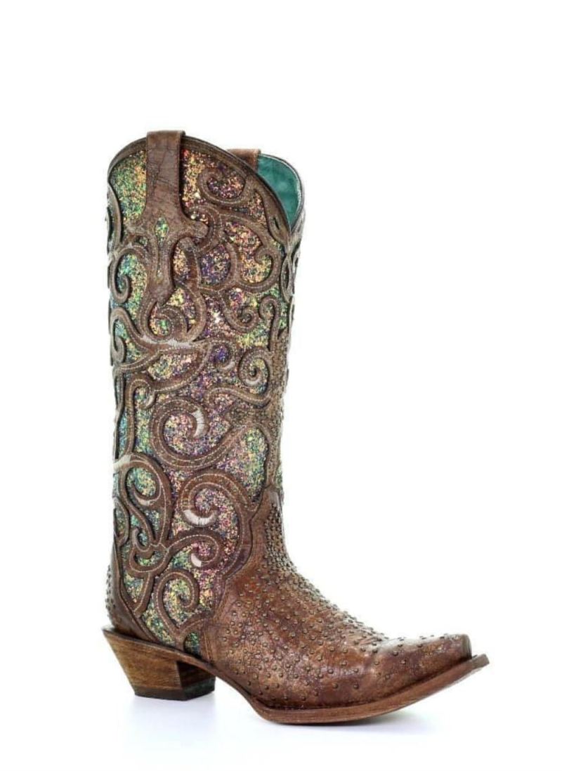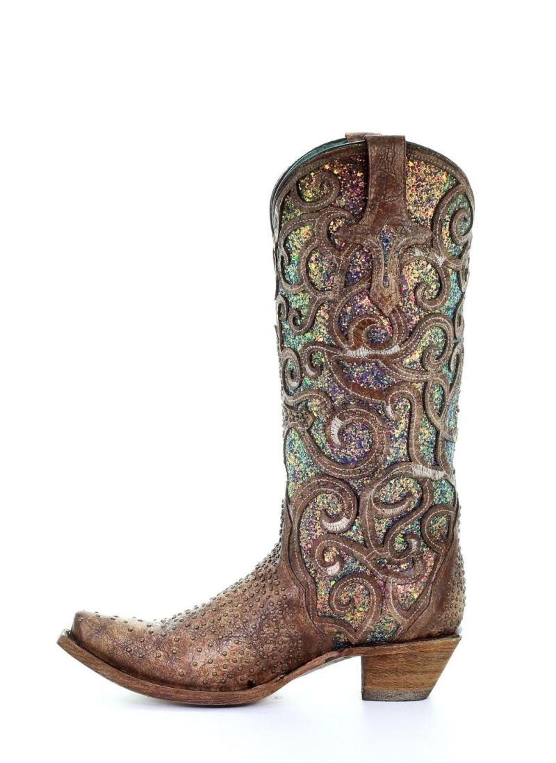 Ladies Cognac/Purple Glitter Inlay & Studs -This boot features a full studded tobacco vamp, embroidered overlay swirls and a purple iridescent glitter for the perfect contrast.