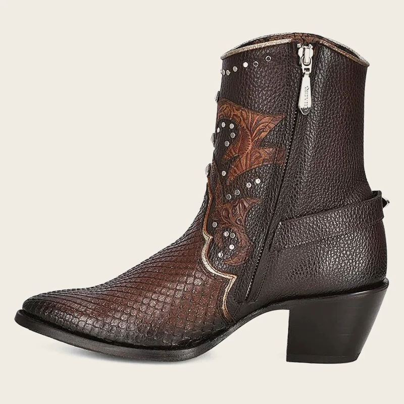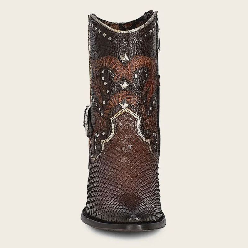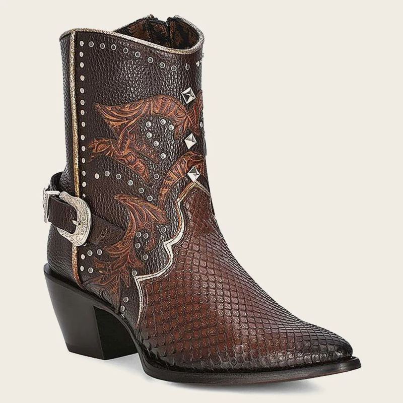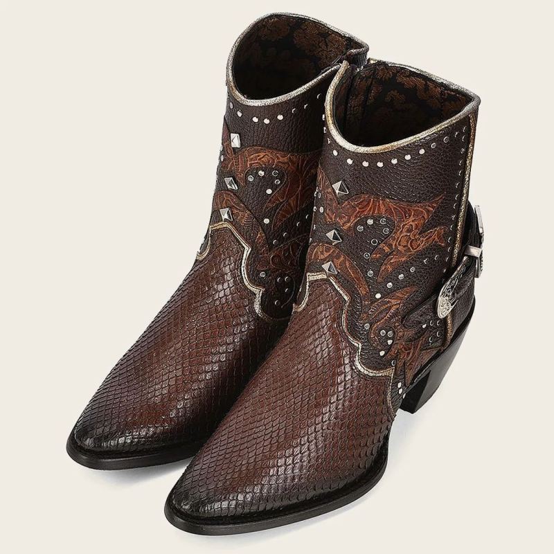 Make a bold fashion statement with our exquisite ankle brown western exotic leather bootie from our exclusive collection. Crafted with care and precision, these ankle boots feature genuine python and bovine leather for durability and a luxurious appearance.