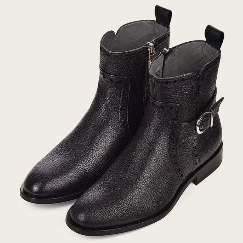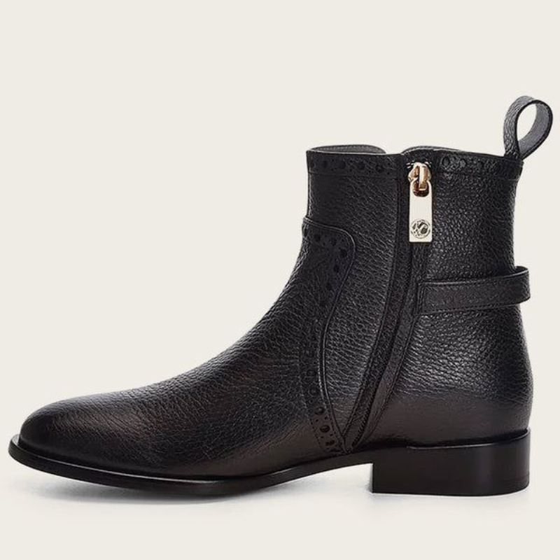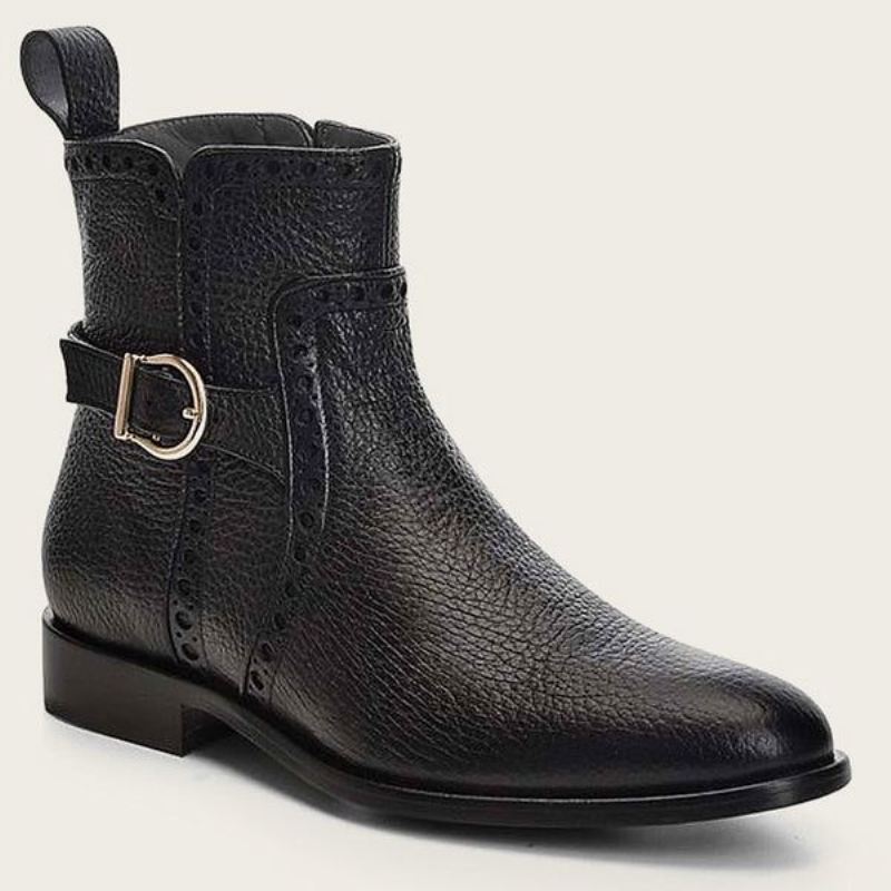 Add a touch of luxury to your footwear collection with our ankle boots for women made from genuine deer leather. The boots feature exquisite brocade details and a fine metal buckle on one side, creating a chic and stylish look. Equipped with an internal closure and dual-density leather sole with TPU insert, these boots offer both comfort and durability.