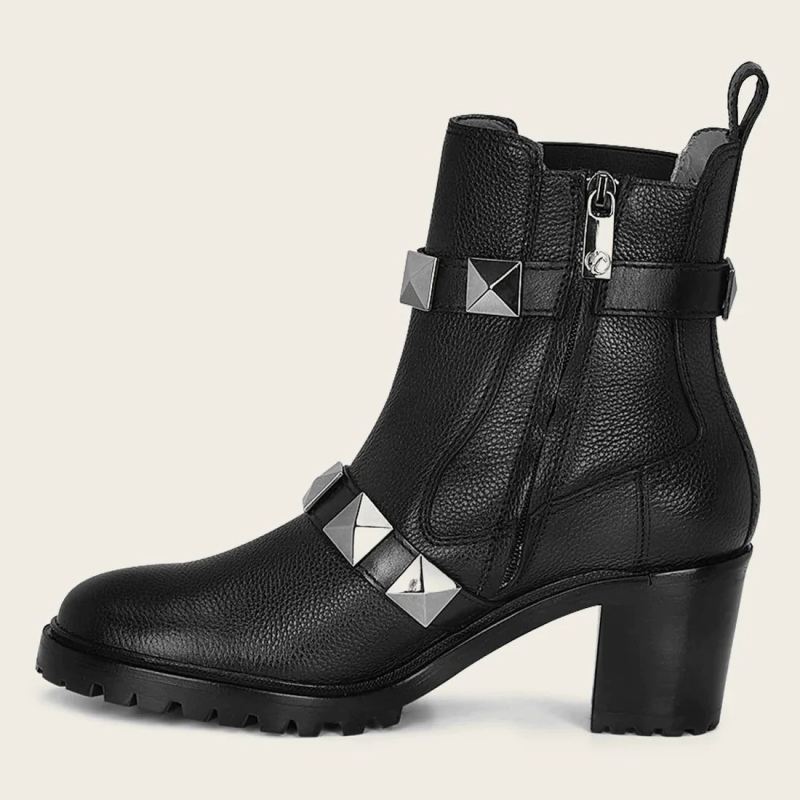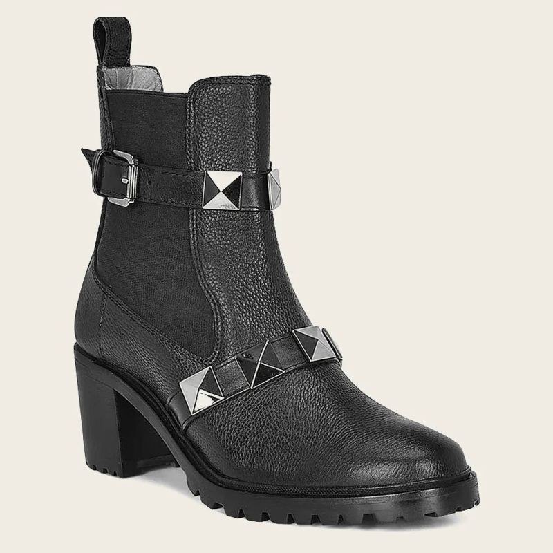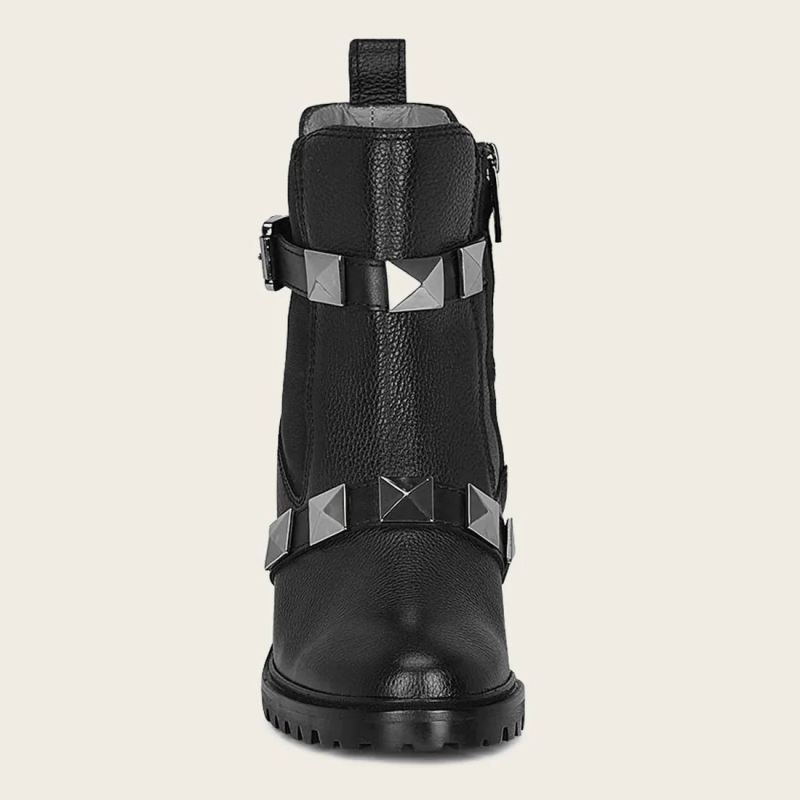 Urban black bootie with decorative stripes for women in genuine bovine leather. It features decorative straps in front and around the tube. With metal studs and a buckle on one side.