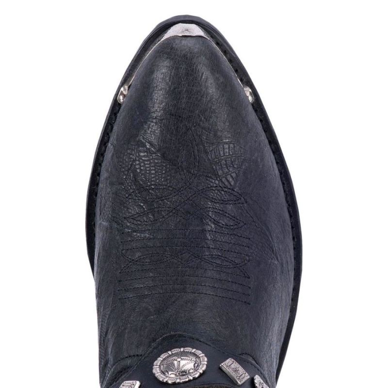 For a good-looking boot at an affordable price, meet the Suiter. Made of black pig skin. Features monochromatic stitching on the shaft. The concho harness has silver accents to match the toe and heel rand. Comes with a round toe and Cushion Comfort insole.