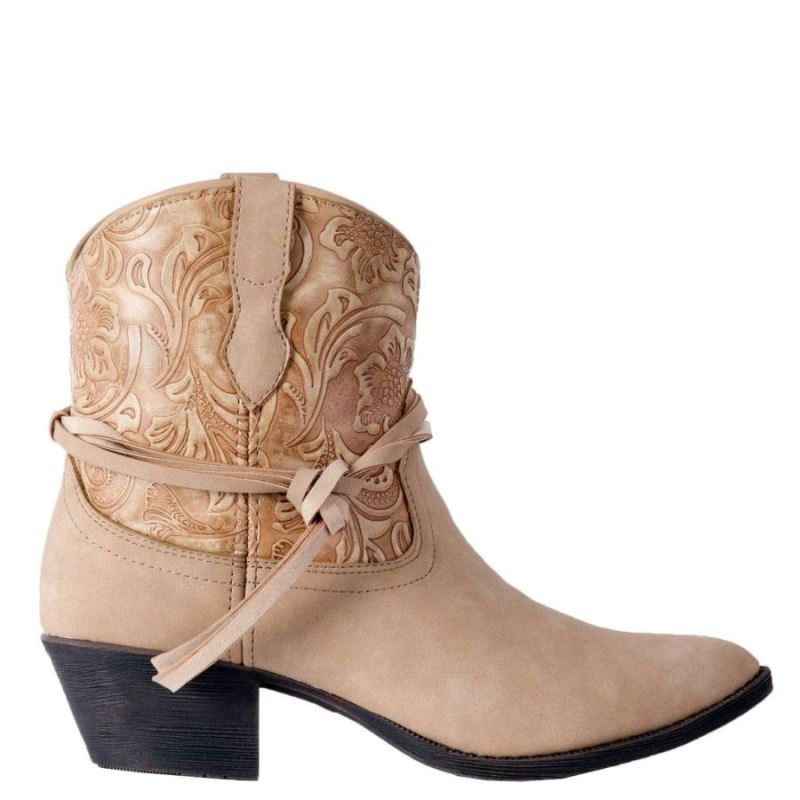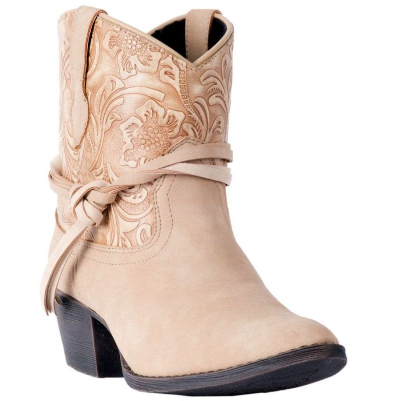 The Valerie bootie is simply beautiful. Designed with a smooth leather foot and tooled leather shaft with a charming floral print. The ankle is layered with leather straps secured with double knots. Comes with a round toe, low western heel, and a Cushion Comfort insole.