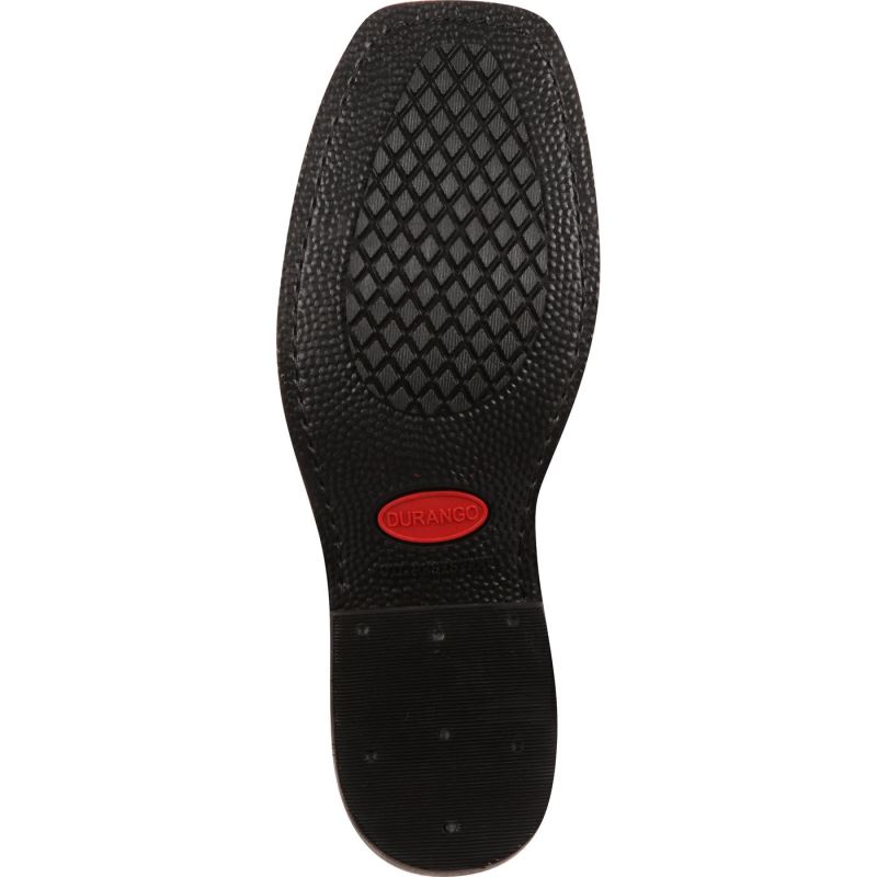 On the bottom of this men's boot there is a Durango Rubber outsole; its black hue looks sharp, it's slip and oil resistant and it will have great durability.