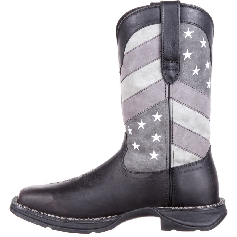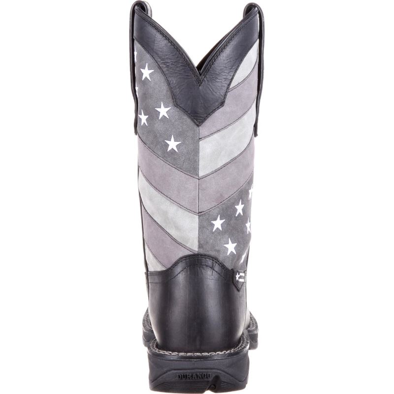 Show off your American spirit and stand out in these Rebel by Durango black and grey faded flag boots today!
