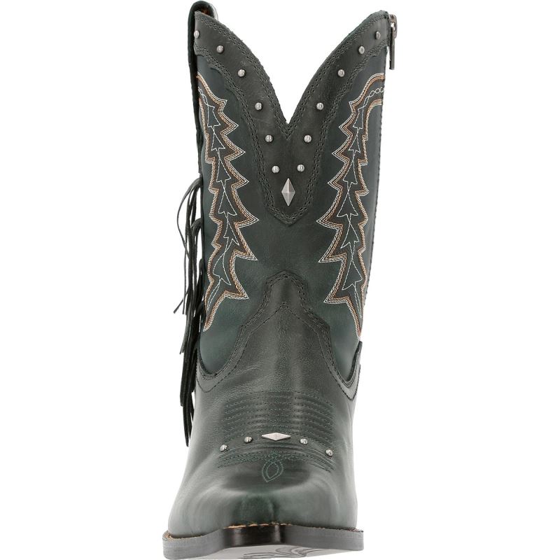 This style is full-grain leather with a faux shaft and beautiful fringe details. It has a soft mesh lining, antiqued silver studs and includes a medial side zipper for easy on/off and the Durango Sole Comfort Footbed.