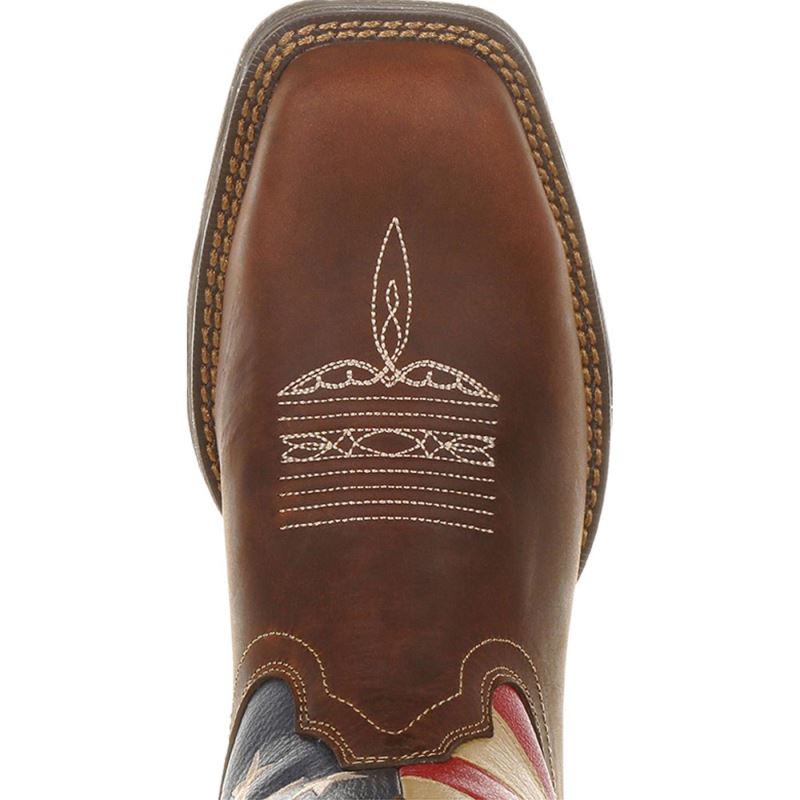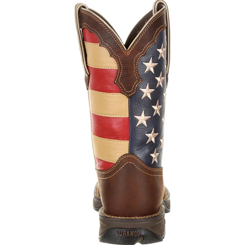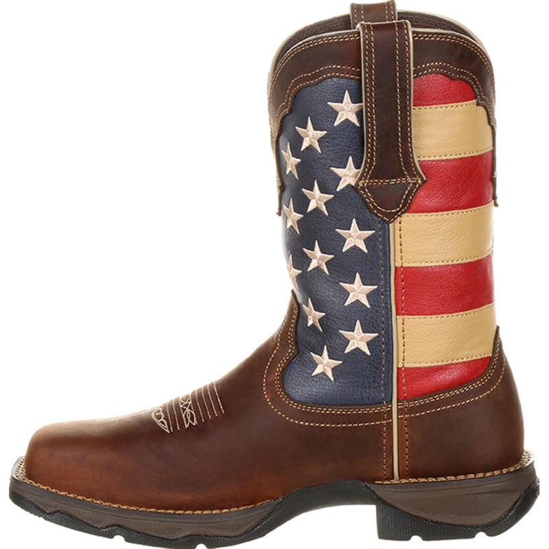 Lightweight comfort doesn't mean lack of style in Lady Rebel Work. This 10 inch Union Flag western steel toe women's western boot features a distressed full-grain leather vamp, fox, collar and pull straps with a brown/union flag colored shaft.