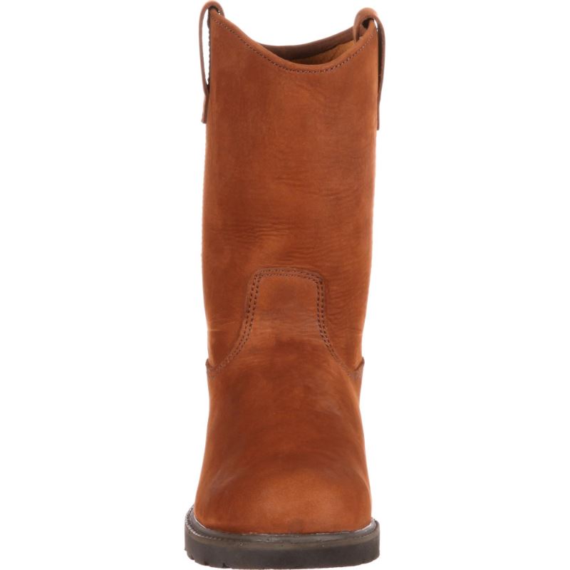 This Georgia men's pull-on work boot has a classic look; whether you're at the job site or hanging out, the footwear will look great in any setting. These Wellington-style boots are made of comfortable, soft nubuck leather. You'll also be able pull these 11-inch boots on easily because Georgia has made them with strong, sturdy pull loops.