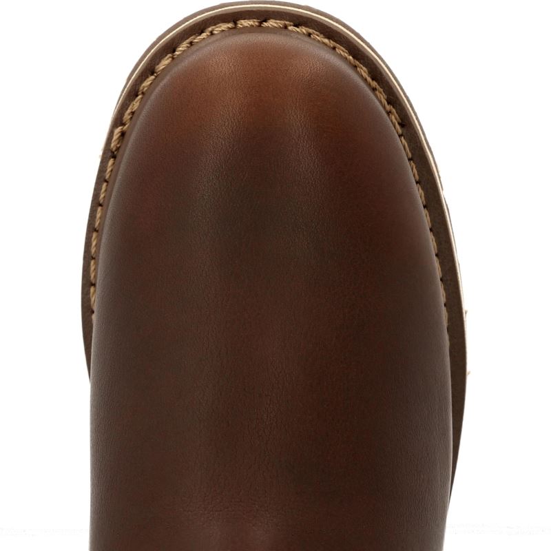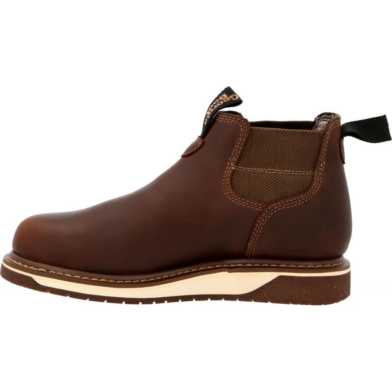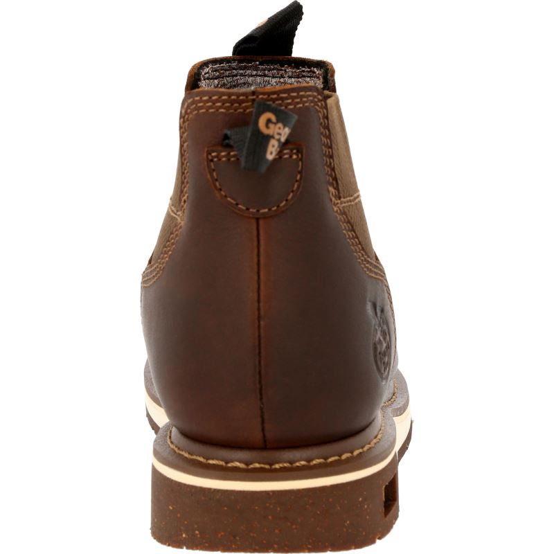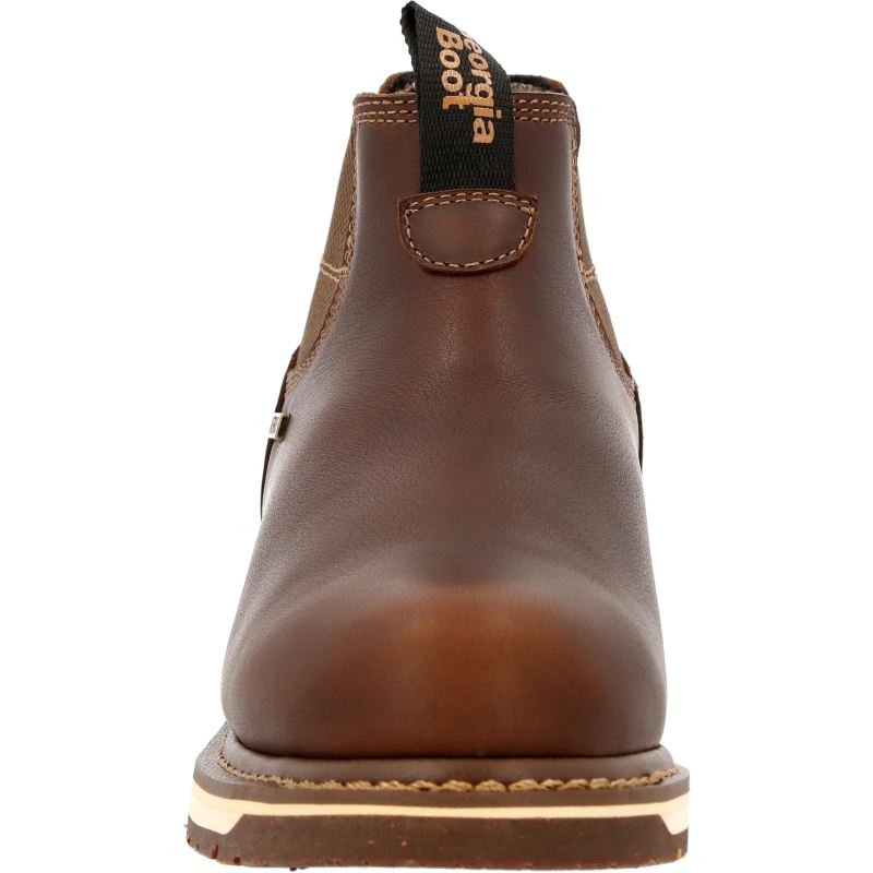 The upper is full-grain SPR leather which is stronger and more resistant to abrasive substances than traditional leathers. Twin gore panels and nylon pull loops allow for an easy on of the women's Chelsea work boot. The Counter Lock System acts as a heel stabilizer while the internal molded 3-D counter pocket locks your heel into place. The interior also features the breathable Georgia Waterproof System, guaranteed to keep water from seeping into when working in wet conditions, and a removable AMP LT memory foam insole.