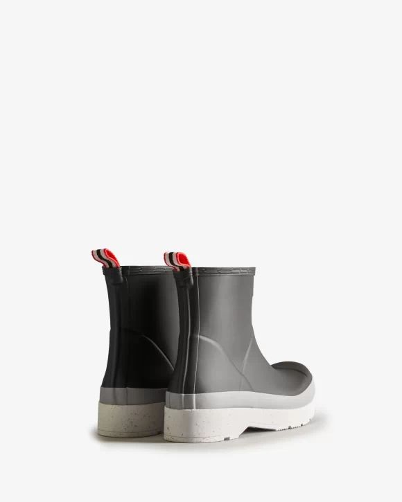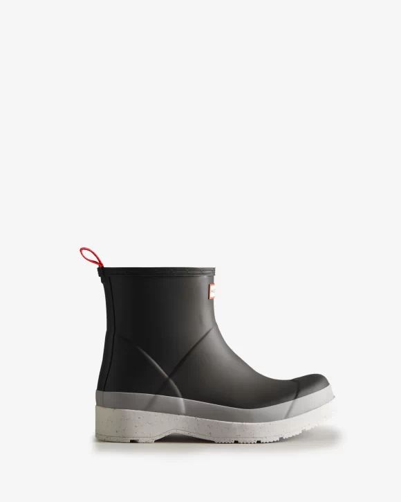 100% waterproof, the Play Short Boot offers a strong and flexible design with a flatter platform sole and angled block heel for maximum comfort. Simplifying the iconic design of the Original Boot, this black men's rain boot in a classic matte with contrast panels and a unique speckled sole, has been updated with a recycled polyester lining and insole.