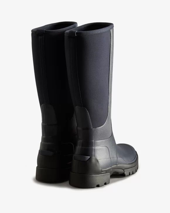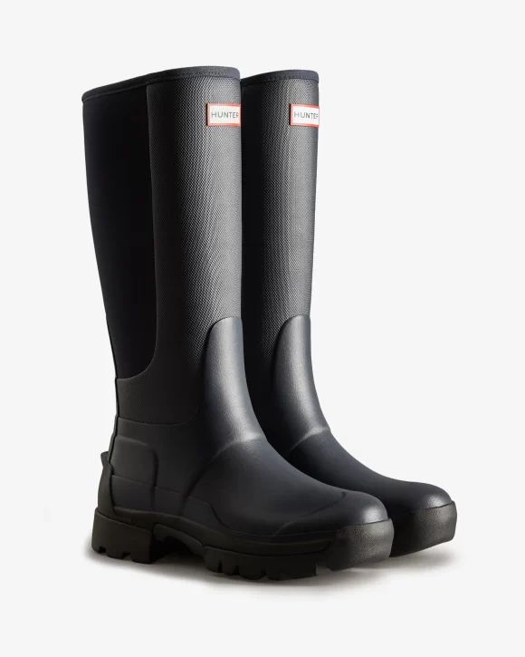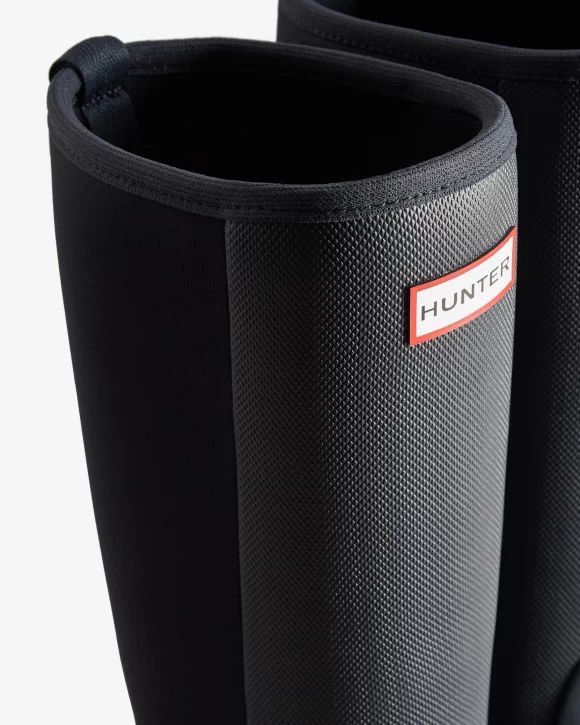 Designed for city and country, the new Balmoral Hybrid Tall Rain Boot bridges the divide between rural paths and urban parks. It delivers comfort, grip and weather protection across many terrains. First introduced in 1987, the Balmoral collection embodies Hunter's philosophy and heritage of pioneering design for those who require excellence in all weathers and landscapes. This new addition to the Balmoral collection has a 100% waterproof lower and handcrafted with a stylish, chunky, pull-on silhouette. The flexible Neoprene backing allows for ease of movement and comfort with every wear. This is coupled with a shock absorption sole and changeable 3mm and 5mm insoles. These black chunky rubber boots are finished with a kick-spur for easy foot removal.