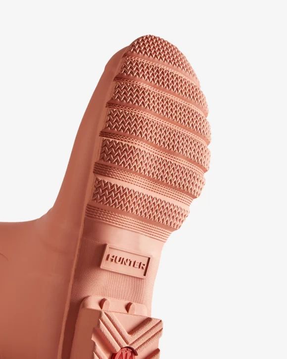 Perfect for wet weather conditions this women's Rain Boot is a shorter version of the iconic Hunter Original Tall Boot. Formed of natural rubber, each boot is handcrafted and assembled over three days before being vulcanised for superior protection. Featuring the Hunter Original tread pattern, and an updated 100% recycled polyester lining and insole, this matte pink waterproof boot is a rainy-day necessity.