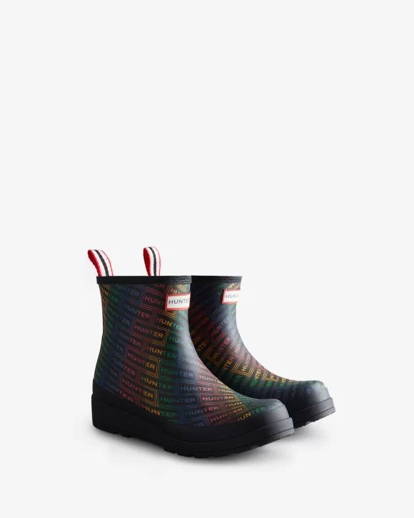 The Rainbow Print Play Boot offers a dynamic silhouette with a flatter platform sole for maximum comfort and versatility. Crafted from the highest quality natural rubber with a recycled polyester lining and insole, this silver women's rain boot is 100% waterproof. Updated with our Hunter logo rainbow print, it blends playfulness and practicality.