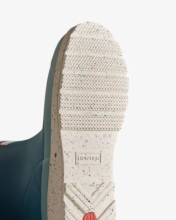 The iconic design of our Original boot inspired our more minimalist PLAY boot, which has a flat platform sole for maximum comfort. Crafted from the highest quality natural rubber, this women's rain boot is completely waterproof and has been updated with a 100% recycled polyester lining and insole. Just grazing the top of the ankle, this contrast green boot is fashioned with contrast lines and a unique speckled sole.