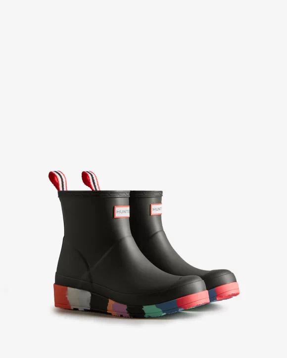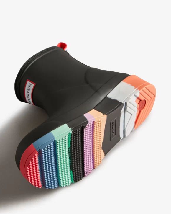 Every pair of PLAY Stripe Sole Boots are completely unique. The flat platform striped sole and angled heal is crafted using a special pigment mixing process that guarantees each pair is one-of-a-kind. 100% waterproof and crafted from natural, vegan rubber, with a lighter, more streamlined silhouette, the black and multicolored PLAY Stripe Sole Boots grazes the top of the ankle and feature a pull-on tab for ease of foot entry.