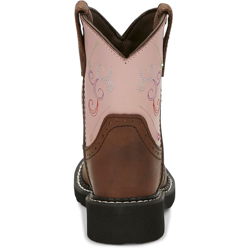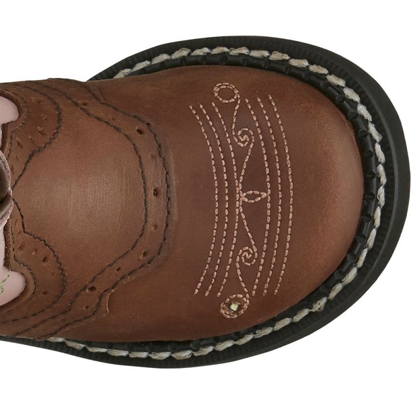 Its pastel pink leather upper provides a perfect backdrop for the colorful stitch pattern and is paired with a chocolate brown foot. The sweet stitch pattern on the pull straps and along the toe are small details that make this boot unique. The soft round toe and unit heel provide an easy fit and the J-Flex Flexible Comfort System" insole with removable orthotic inserts add cushion and support so your little one can run free.
