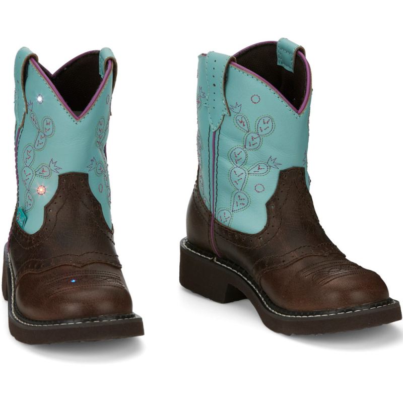 Our Glitzy boot in Brown leather features a turquoise upper with cute cactus embroidery, with light sensors designed to illuminate with her every step, stomp and jump. The Room 2 Grow removable orthotic insole inside can be removed as your child's foot grows, adding an extra half size to the boot, and a rubber sole will give her the flexibility and traction she needs.