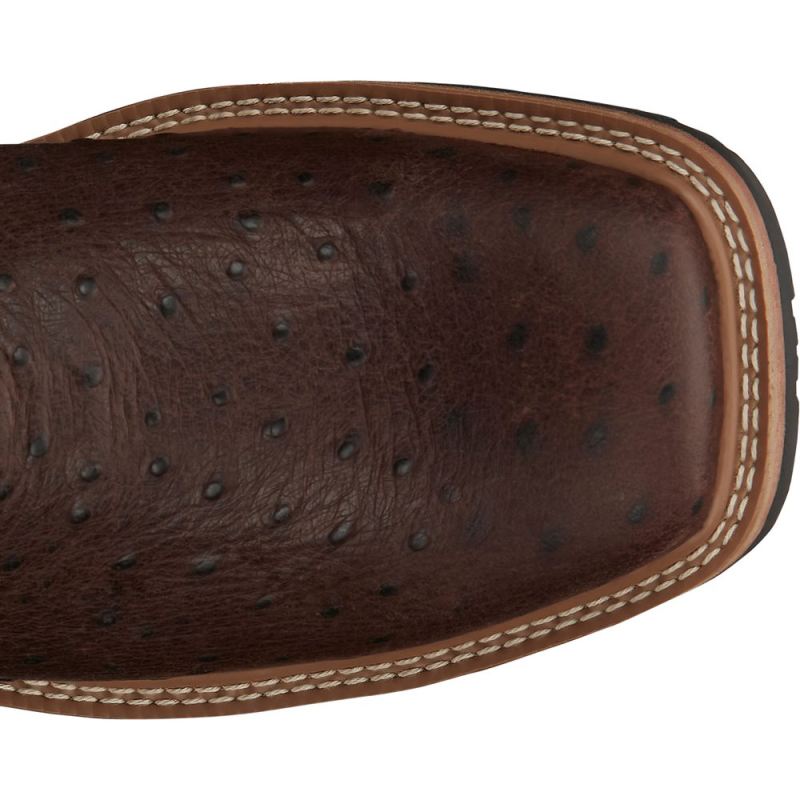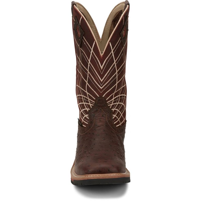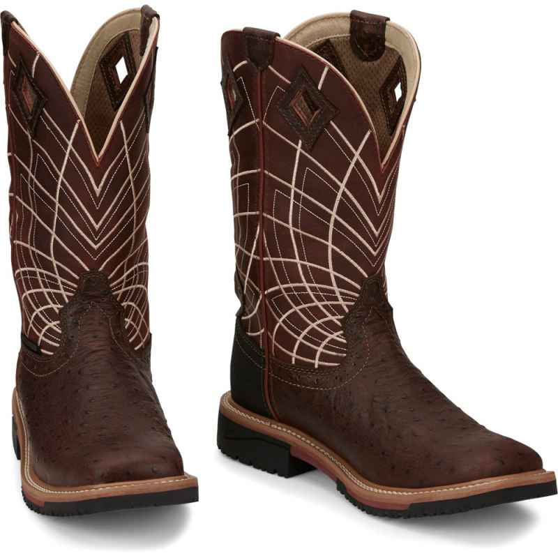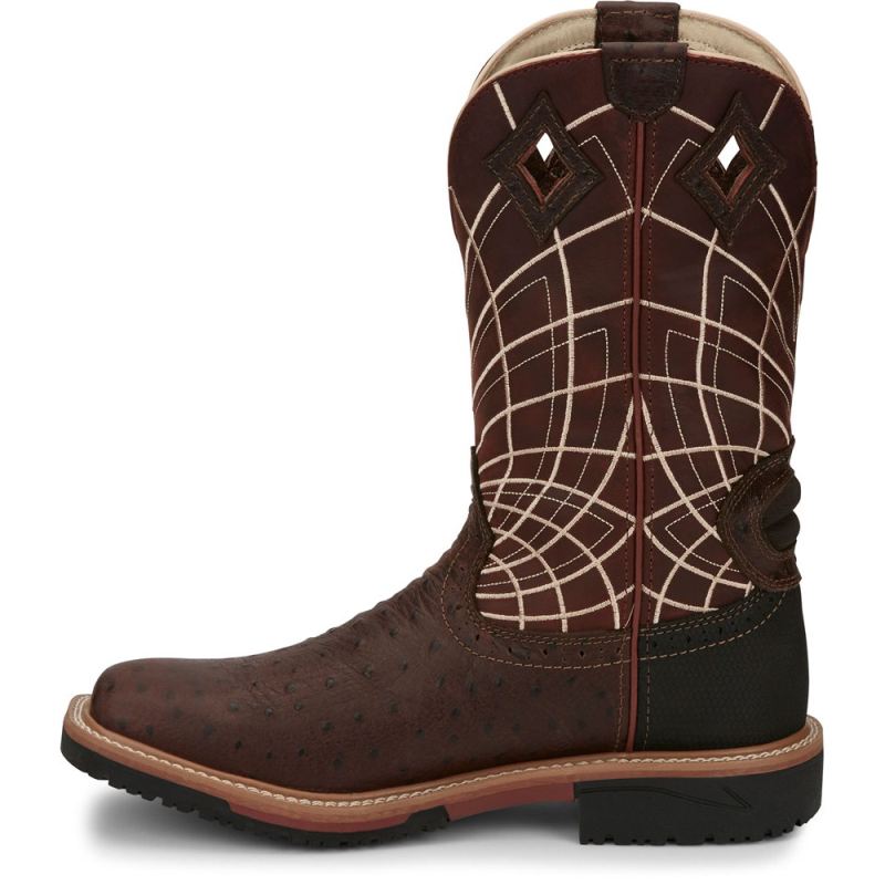 A bold radiating web pattern accents the Burgundy shaft, and the Rust Ostrich Print toe adds exotic appeal. Inside, this boot features layers of comfort with a J-Flex Flexible Comfort System" insole, the Justin Stabilization Technology", Ortholite" Comfort Foam insole, and a Dri-Lex" cover. Its multi-density rubber and EVA combination outsole offers lightweight durability. This boot also provides an Achilles Relief System" that eliminates weak spots in foot comfort by using stretchable material, high-density foam, and moisture-wicking anti-microbial lining to provide flexibility, support and breathabilitythe Hybred" Orthotic insole provides all-day comfort. This boot meets ASTM F2892-11, EH safety footwear standards.