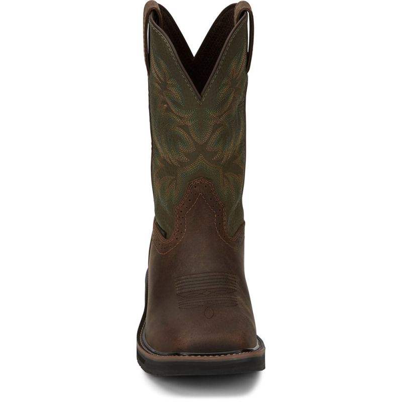 Its cactus green leather upper is embellished by a vibrant green and yellow stitch pattern and is paired with a polished brown square toe vamp. This boot features a steel toe for added protection, the J-Flex Flexible Comfort System" insole that cushions and supports the foot, and the Stampede dual density rubber outsole with resistance to abrasion, chips, slipping, and marking which allows you to comfortably work on any surface and meets ASTM F2413-11, I75, C75 EH safety footwear standards.