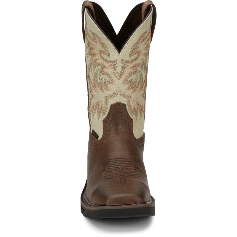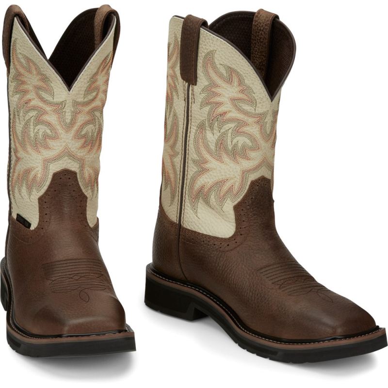 Its clean ivory leather upper is embellished by a retro-themed yellow, red, and green stitch pattern with a rich brown square toe vamp. The square steel toe provides protection and impact-absorption so you can feel confident stepping on to any job. This boot also features the J-Flex Flexible Comfort System" insole that adds cushion and support and the Stampede dual density rubber outsole with resistance to abrasion, chips, slipping, and marking which allows you to comfortably work on any surface and meets ASTM F2413-11, I75, C75 EH safety footwear standards.