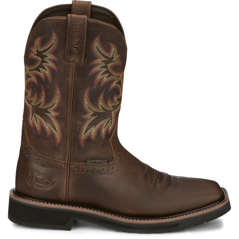 Its built for durability and comfort in even the roughest work conditions with a distressed golden brown leather exterior that is also waterproof for added protection against the outdoor elements. The yellow, orange, blue stitch pattern along the upper give this boot a retro feel and its square toe provides a relaxed fit. The J-Flex Flexible Comfort System" insole cushions and supports the foot and the Stampede rubber and EVA combination outsole guarantees resistance to abrasion, chips, slipping, and marking allowing you to comfortably work on any surface.