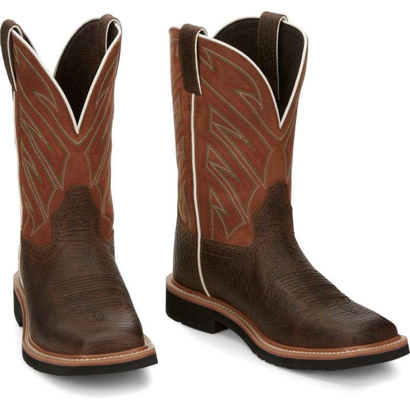 The parched orange upper and dark brown lower gives this pull-on boot subtle style. It's constructed for convenience and durability with an orthotic insole and standard Stampede Rubber outsole is resistant to abrasion, chips, slipping, and marking so it's ready to take on the toughest terrain.