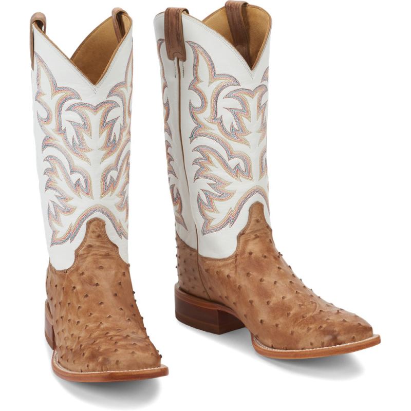 The golden tan full quill ostrich foot with matching pull straps is slightly distressed giving this boot a vintage feel. The square toe and long base heel provide a relaxed fit in the stirrup and the J-Flex Flexible Comfort System" insoles support and cushion the foot for lasting comfort.