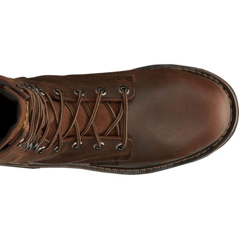 Take on the work day in the 8" tall Pulley Composite Toe Men's work boot with a distressed brown waterproof leather exterior.