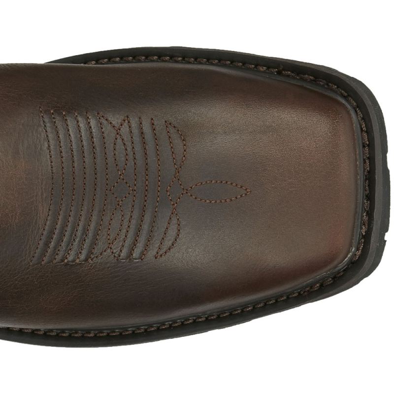 The 10" Ricochet Square Composite Toe Met Guard boot from the Stampede Collection is a hardworking boot designed for ultimate protection and performance in dark brown and rust waterproof water buffalo leather.