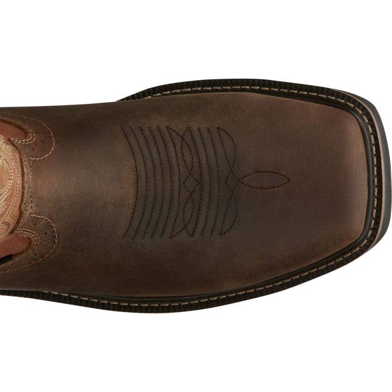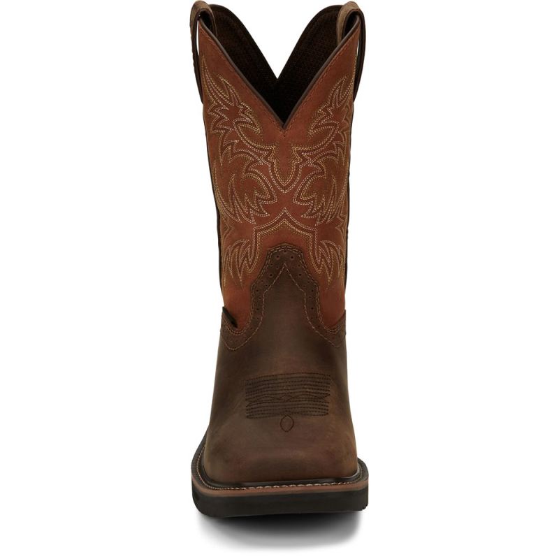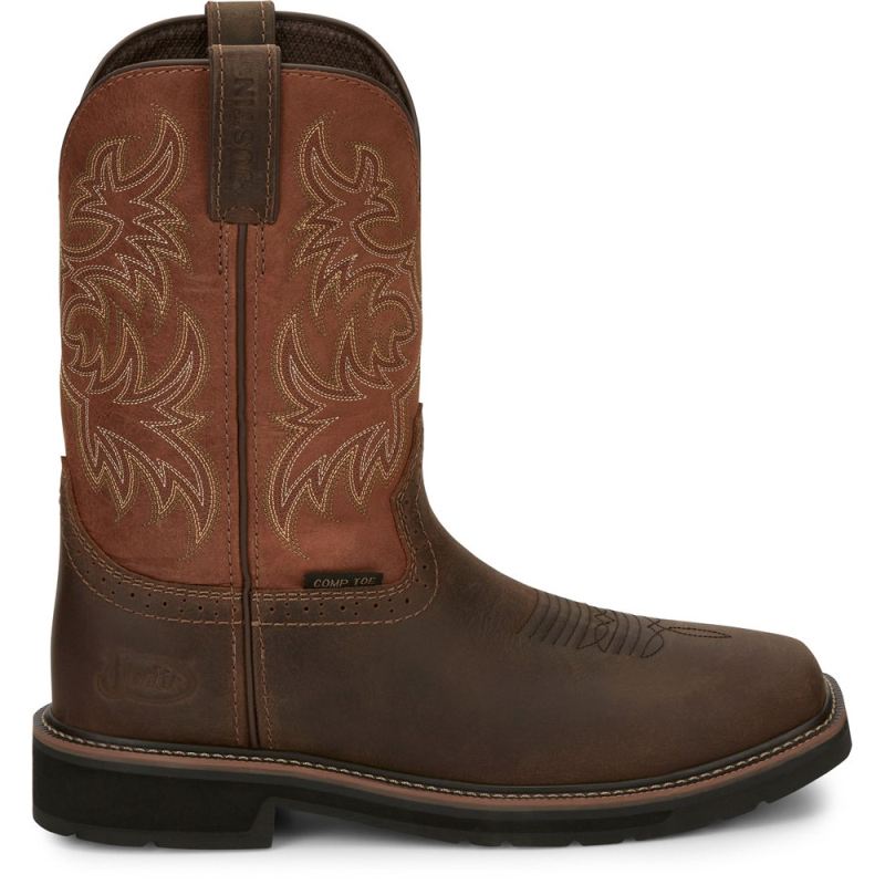 Its light reddish tan upper is embellished by a green, yellow, and cream stitch pattern and is paired with a stonewashed golden brown square toe vamp. The composition toe provides an armor-like shield and meets safety standards without weighing your foot down. This boot also features the J-Flex Flexible Comfort System" insole that adds cushion and support and the Stampede dual density rubber outsole with resistance to abrasion, chips, slipping, and marking which allows you to comfortably work on any surface and meets ASTM F2413-11, I75, C75 EH safety footwear standards.