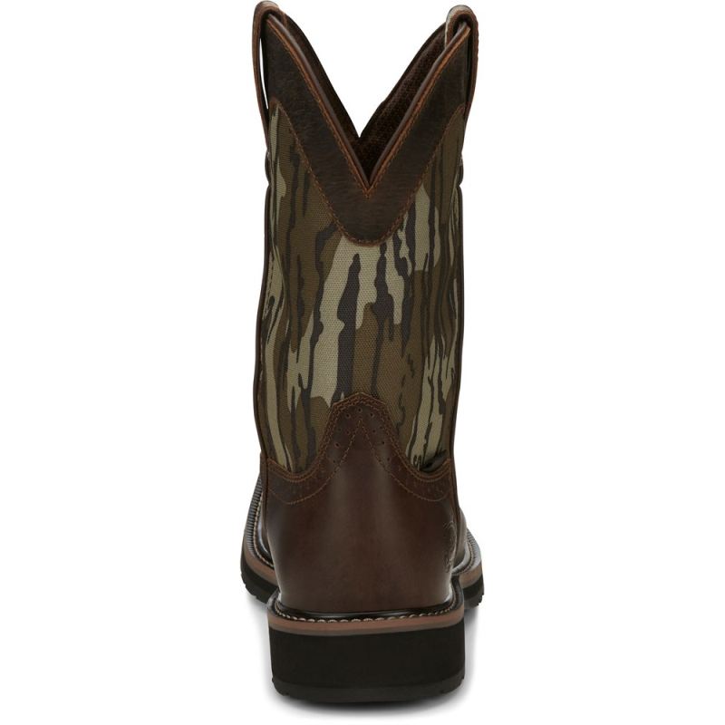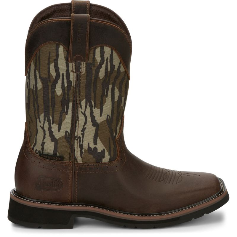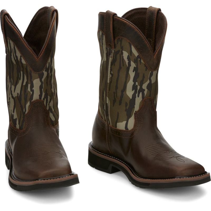 Designed to withstand wet environments and harsh conditions, the 11" Trekker boot from the Stampede Work collection features a field-proven Mossy Oak" Bottomland upper and a rugged Tan full-grain leather foot.