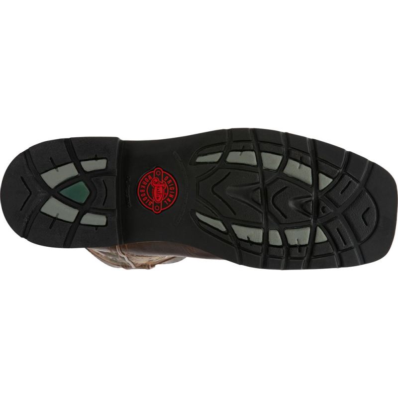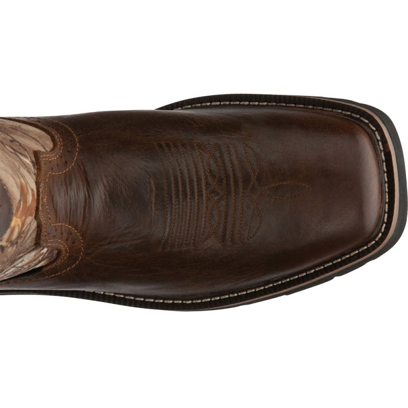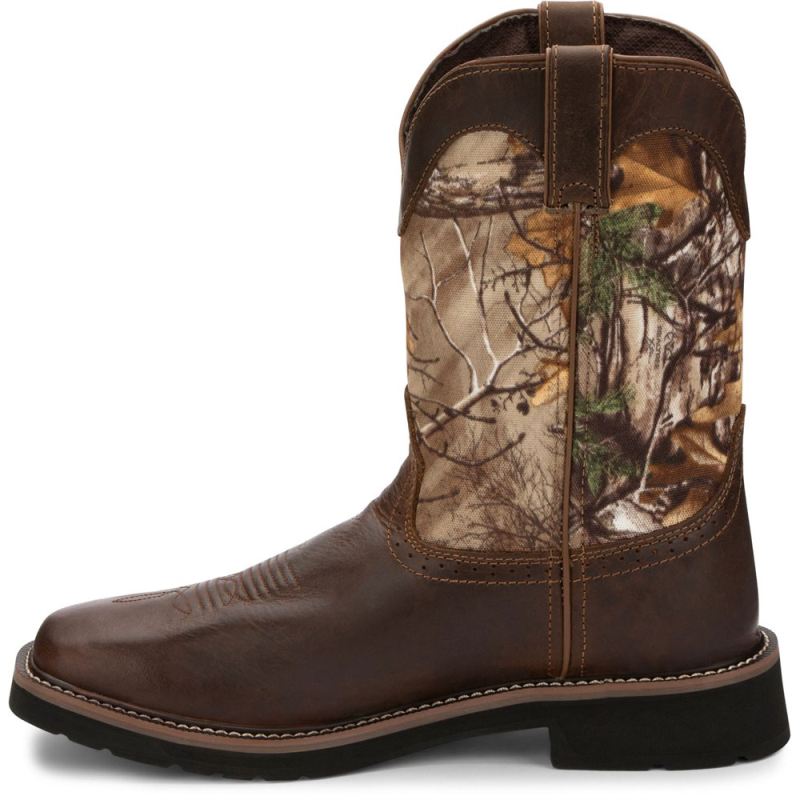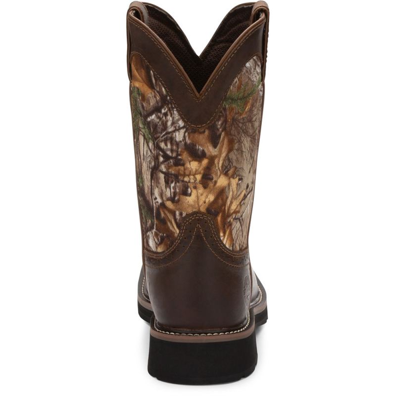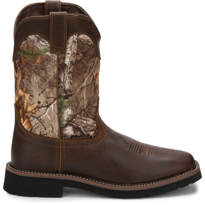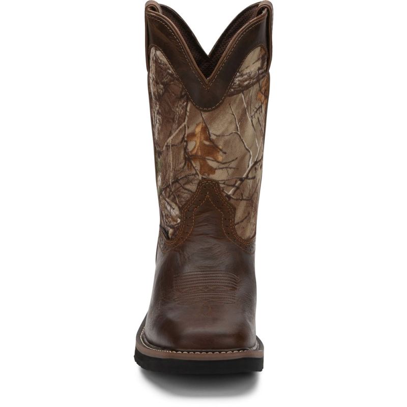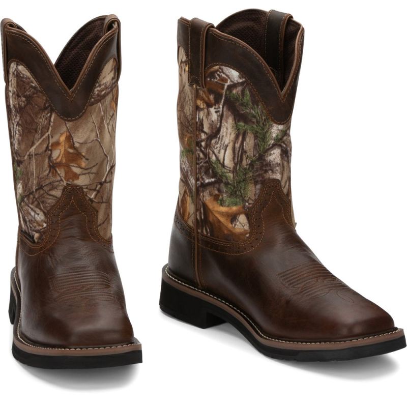 The RealTree"Mini X-tra camo upper is paired with a polished brown leather square toe foot and collar and features a waterproof exterior for added protection when up against the outdoor elements. The J-Flex Flexible Comfort System" insole cushions and supports your foot on or off the trail.
