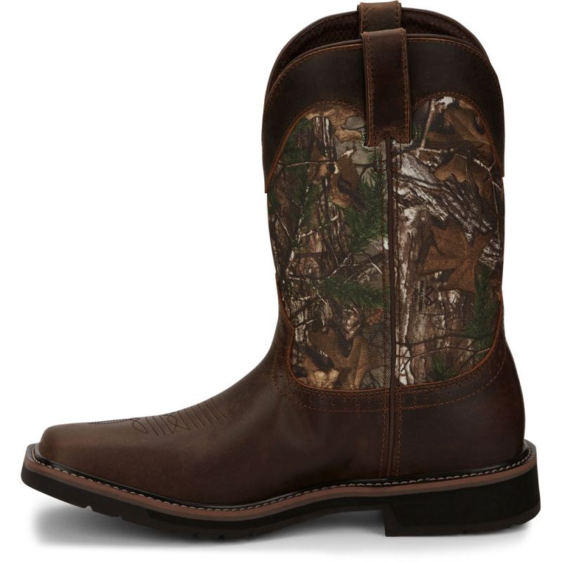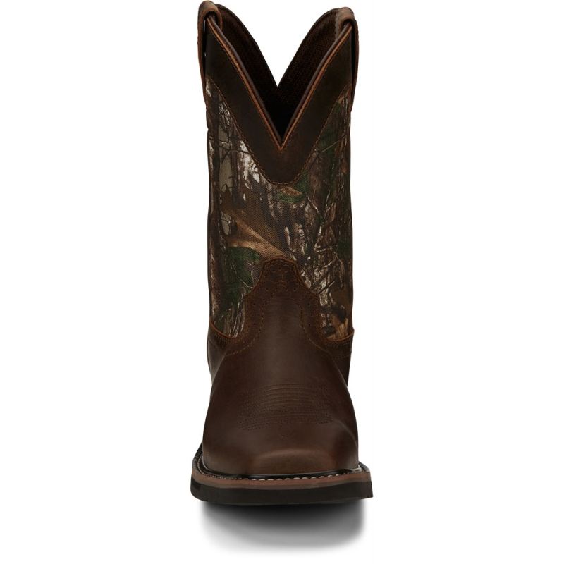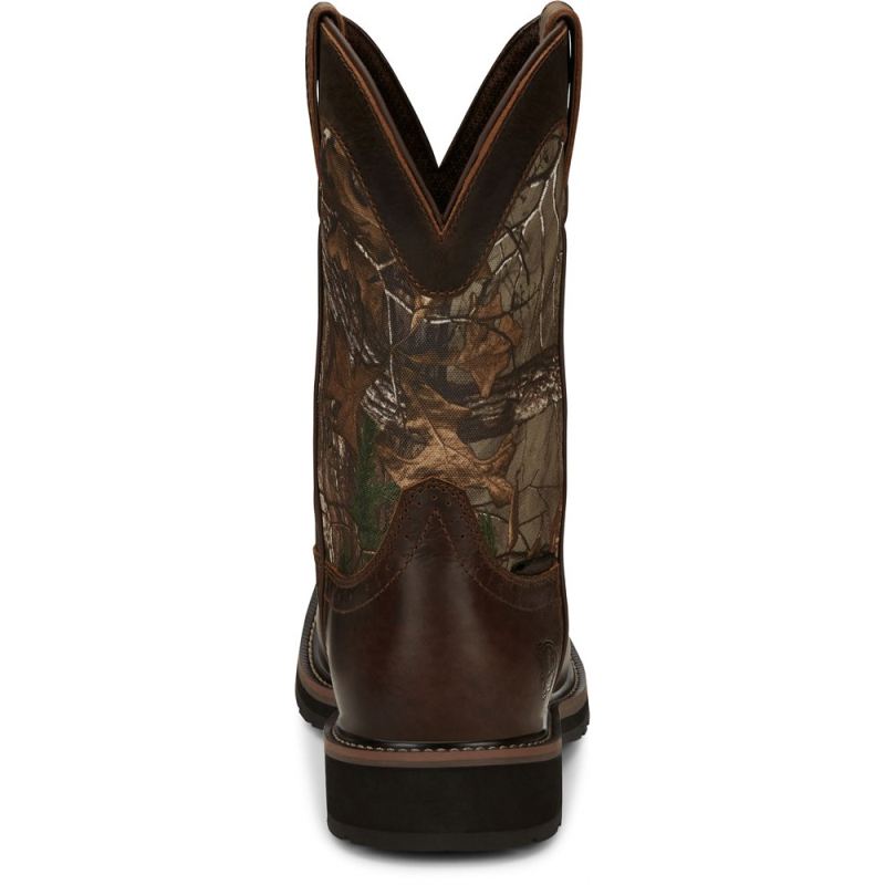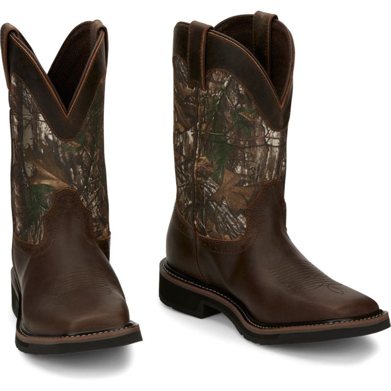The RealTree"Mini X-tra camo upper is paired with a polished brown leather square toe foot and collar and features a waterproof exterior for added protection when up against the outdoor elements. The J-Flex Flexible Comfort System" insole cushions and supports your foot on or off the trail.