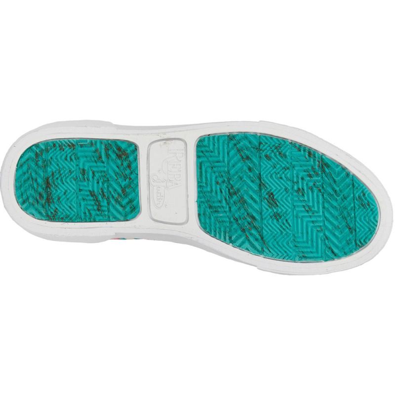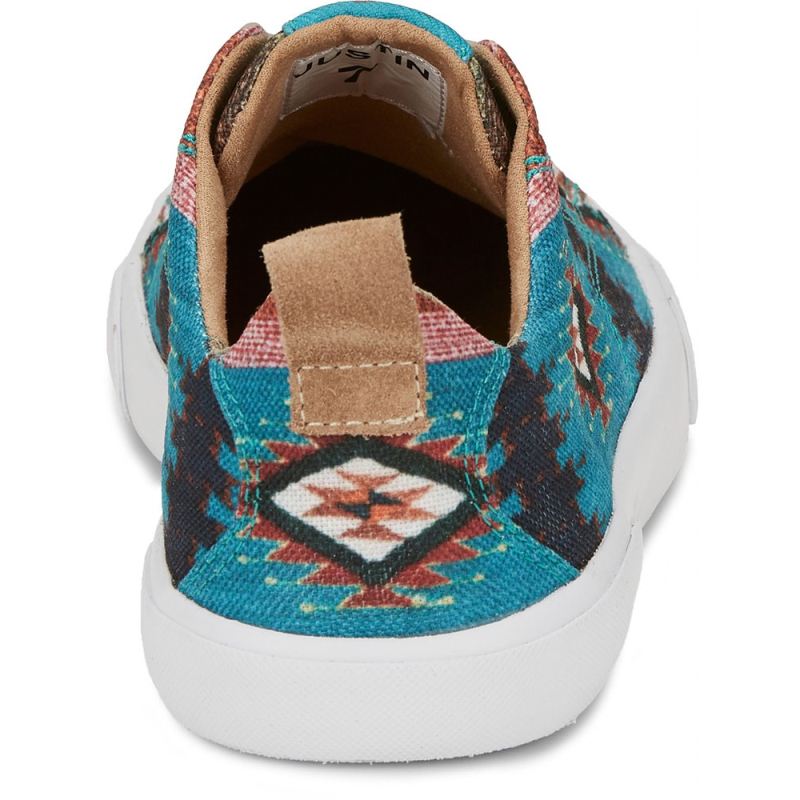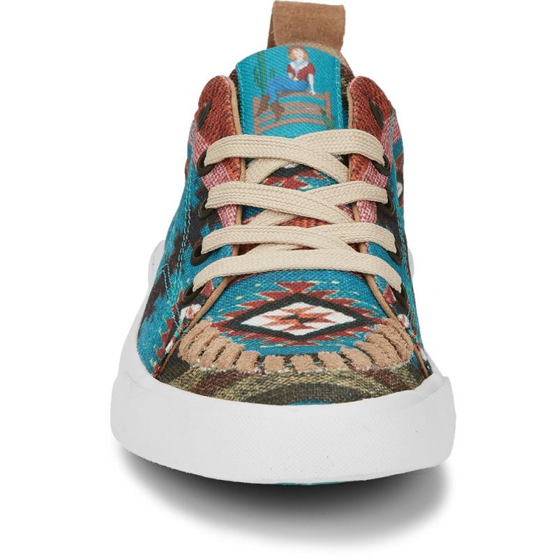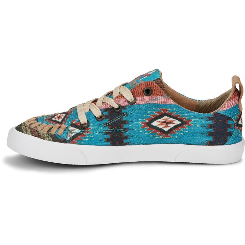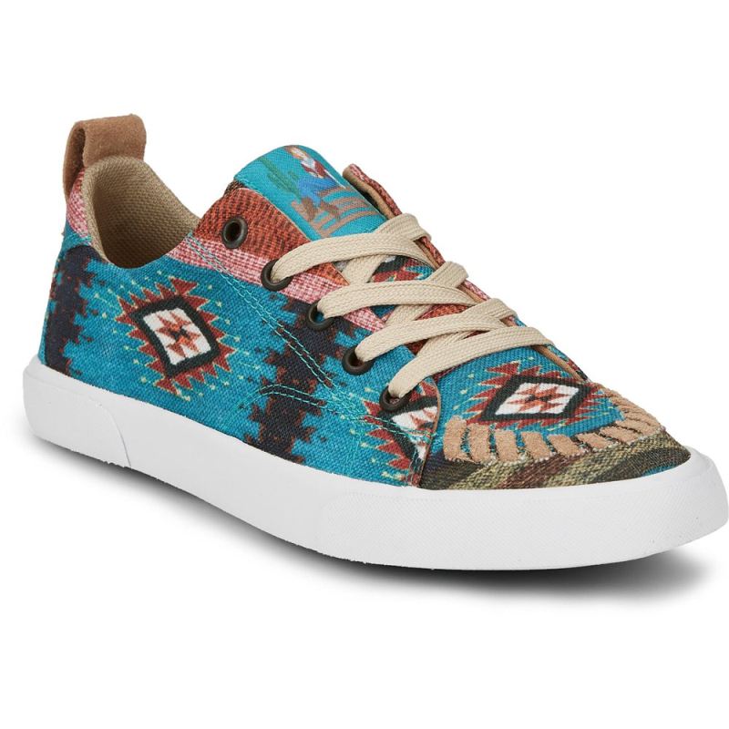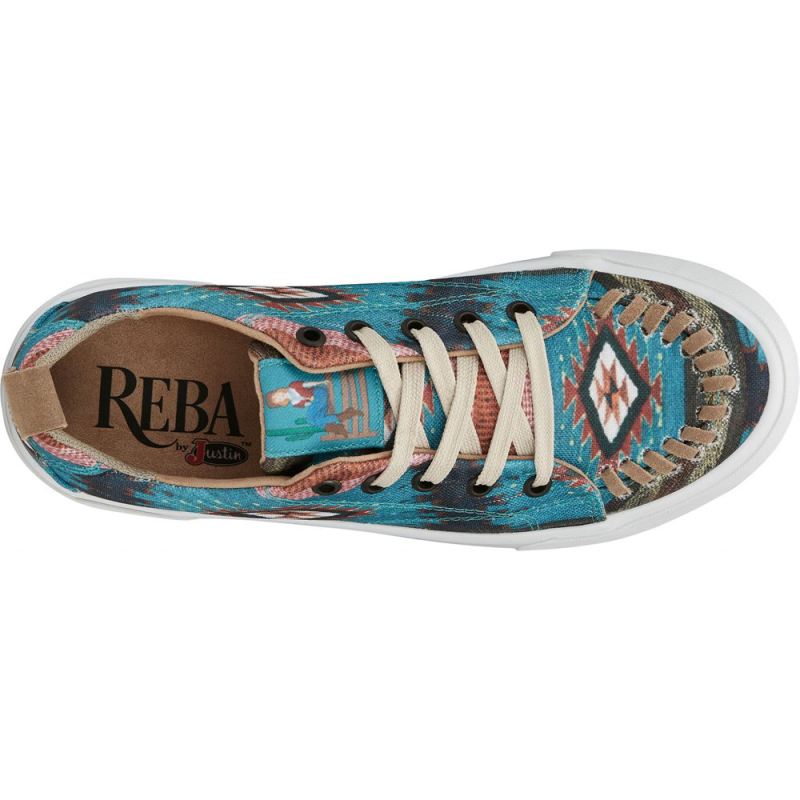 Designed in a bold, festive large-scale Southwest cross print, the Arreba! sneaker in Turquoise is definitely worthy of a cheer! Whipstitching accents add fun texture, and above it all, a retro drawing of Reba, sittin' on a fence, adds the perfect touch. This cool casual look is designed with a cushioned insole for comfort. A Reba by Justin" Exclusive.