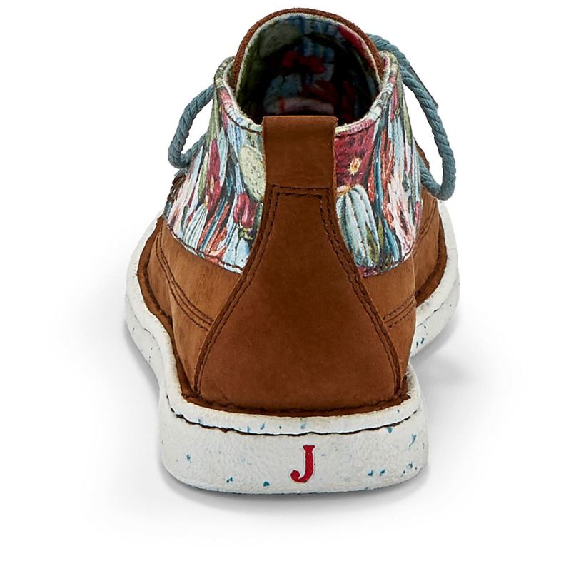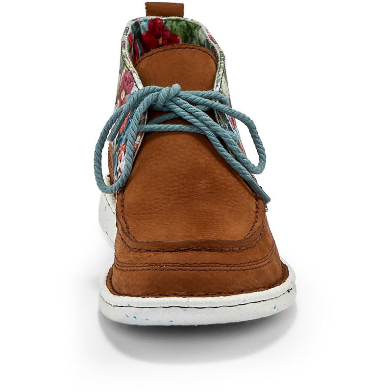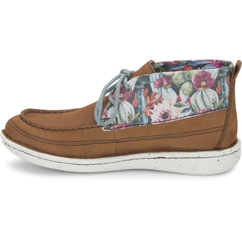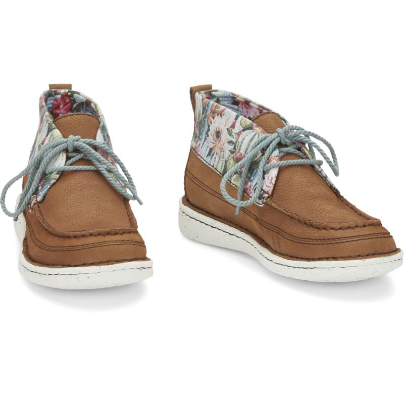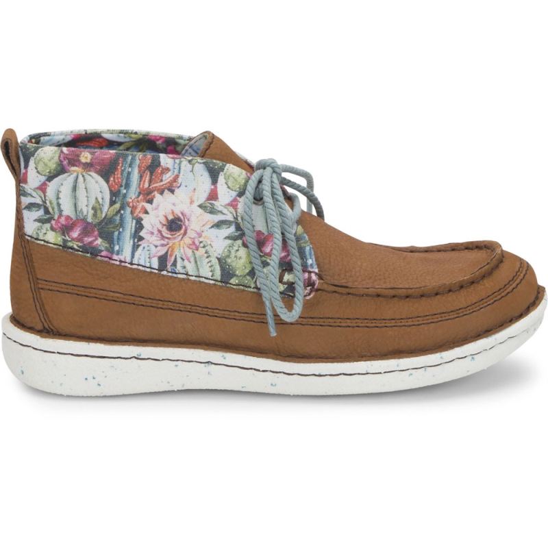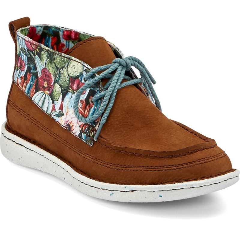 Brightened by a desert floral print of cacti and soft, colorful blooms, the Breezy moc toe bootie in Pecan from the Justin Casuals collection is a laid-back casual shoe with a feminine touch.