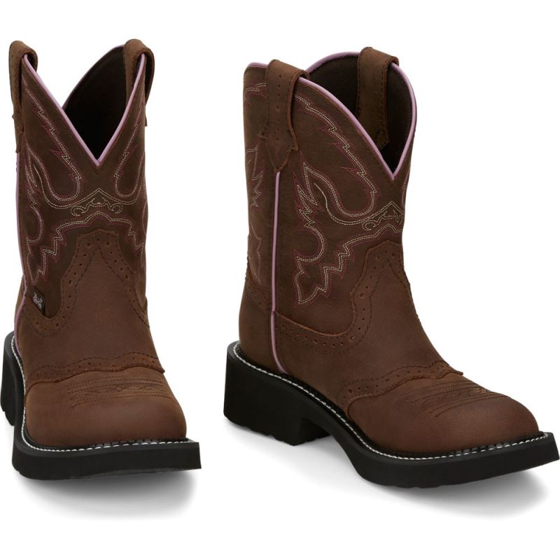 The 8" tall Gemma Aged Bark Justin Gypsy Women's cowboy boot features a chocolate brown leather exterior with a slightly vintage feel.