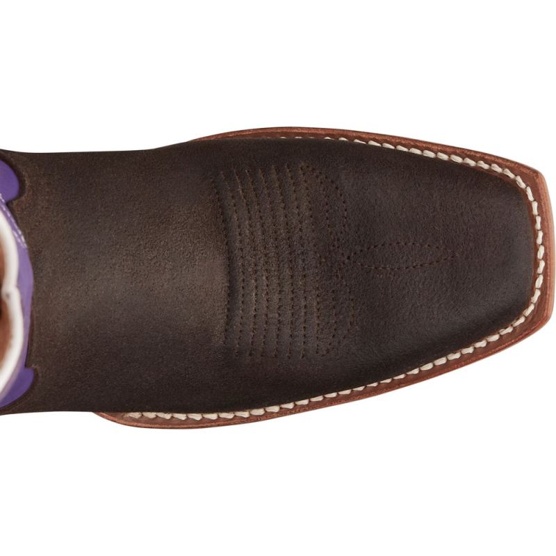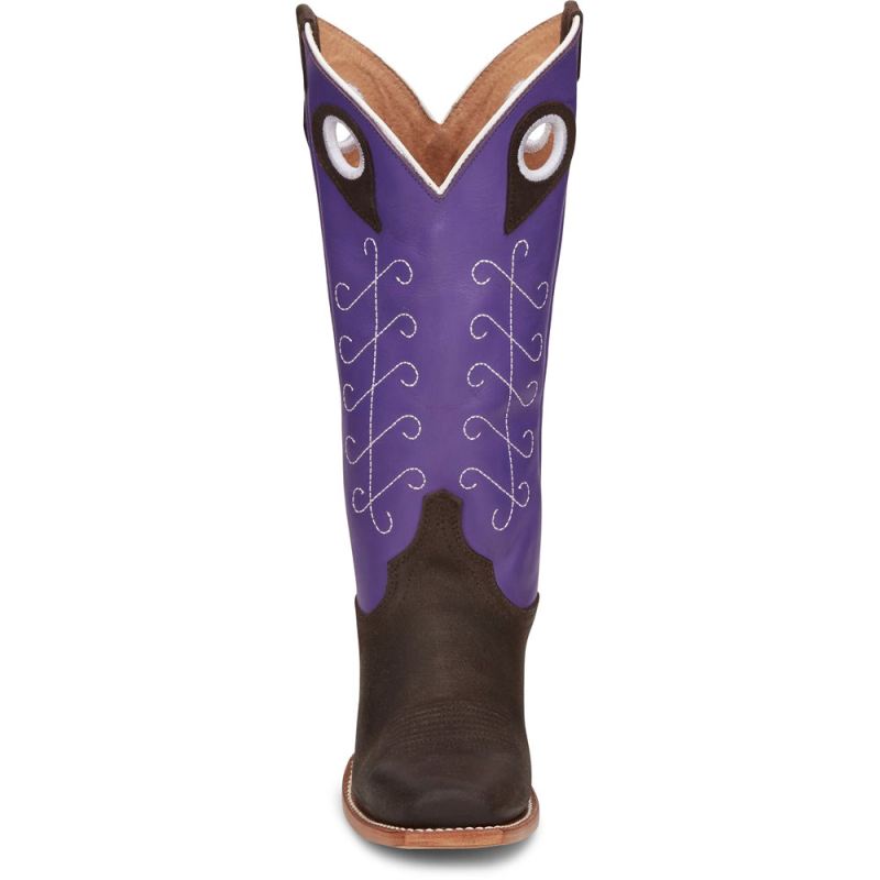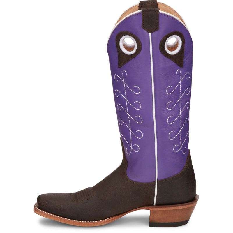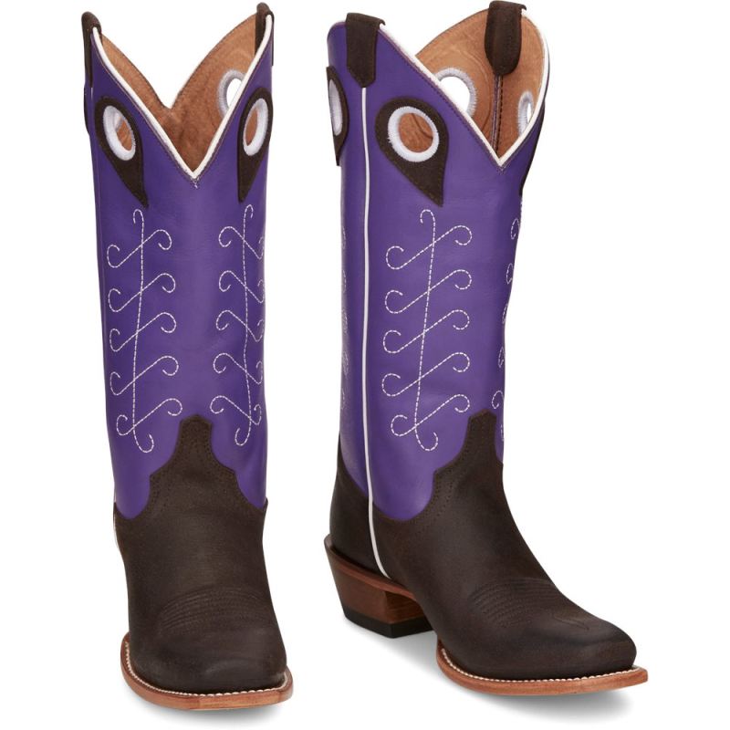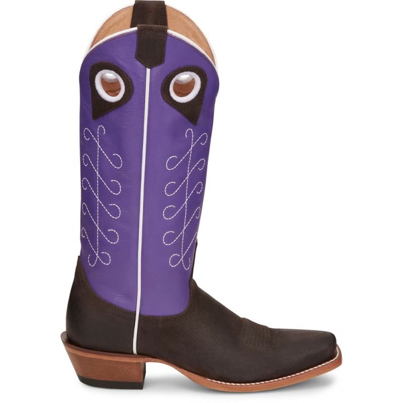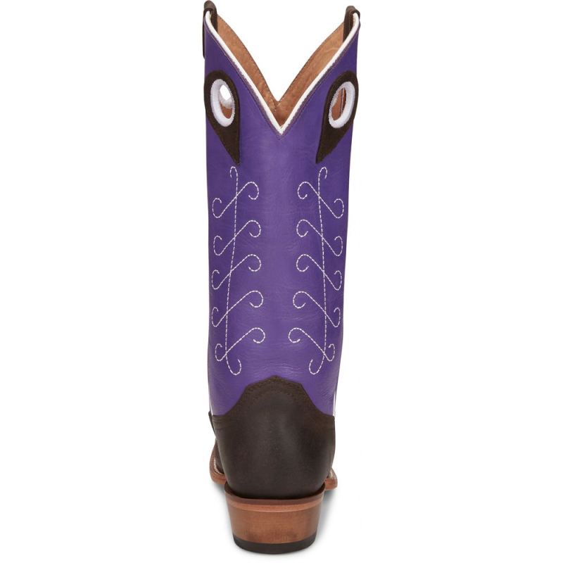 A bold upper in royal purple cowhide commands attention while the chocolate brown cowhide demands respect. White stitching in a unique design ties it all together for a classic feminine look. This vintage-inspired boot is both functional and comfortable. It features a cowgirl underslung heel, a medium square toe, and the J-Flex" Comfort System. Our Punchy collection is crafted of durable leathers that are as tough as the women who put them to the test every day.