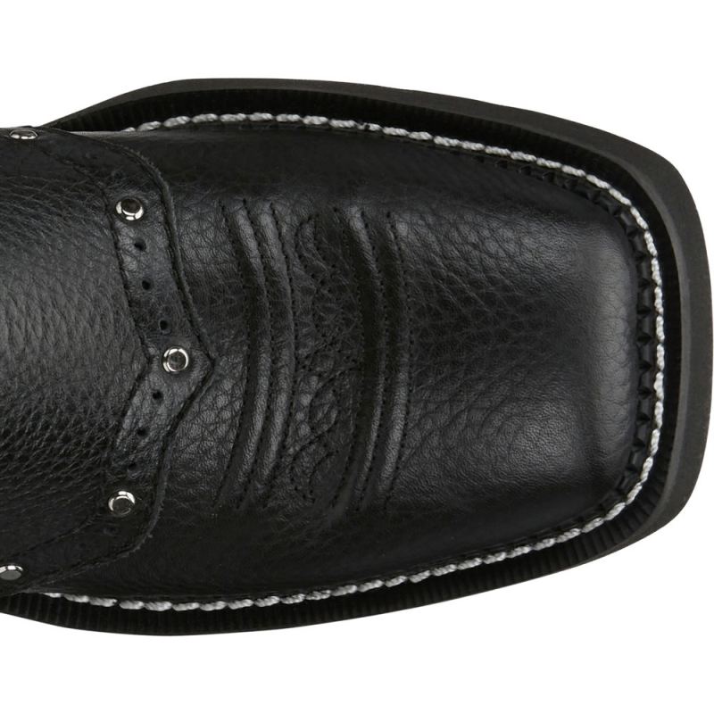 The black suede upper is decorated by a simple white stitch pattern and tastefully placed rhinestones. The diamond cut pull straps and polished perforated saddle foot give this boot a sleek look. It has a relaxed and comfortable fit with a J-Flex Flexible Comfort System" insole and removable orthotic inserts and the black rubber outsole is trendy and functional for the classy cowgirl.