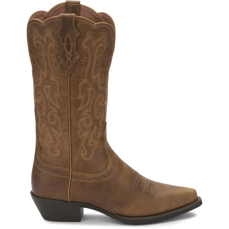 The golden tan leather exterior has a lived-in look is embellished by a subtle brown stitch pattern and its scalloped collar is a subtle feminine detail. The perforated saddle foot features a narrow toe and elevated heel give this boot a fashionable edge and the J-Flex Flexible Comfort System" insoles with removable orthotic inserts guarantee comfort. This boot also features the Justin Stabilization Technology" that uses dual density medical memory foam to stabilize the foot while still allowing it to move as needed.