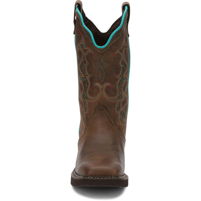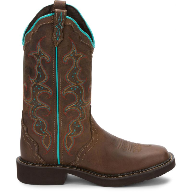 Its distressed golden tan leather exterior features a vibrant and feminine stitch pattern on the upper with a teal seam on each quarter and around the collar giving this boot a vintage feel. It's built for comfort with a square toe and unit heel and the J-Flex Flexible Comfort System" insole with removable orthotic inserts add cushion and support in or out of the saddle.