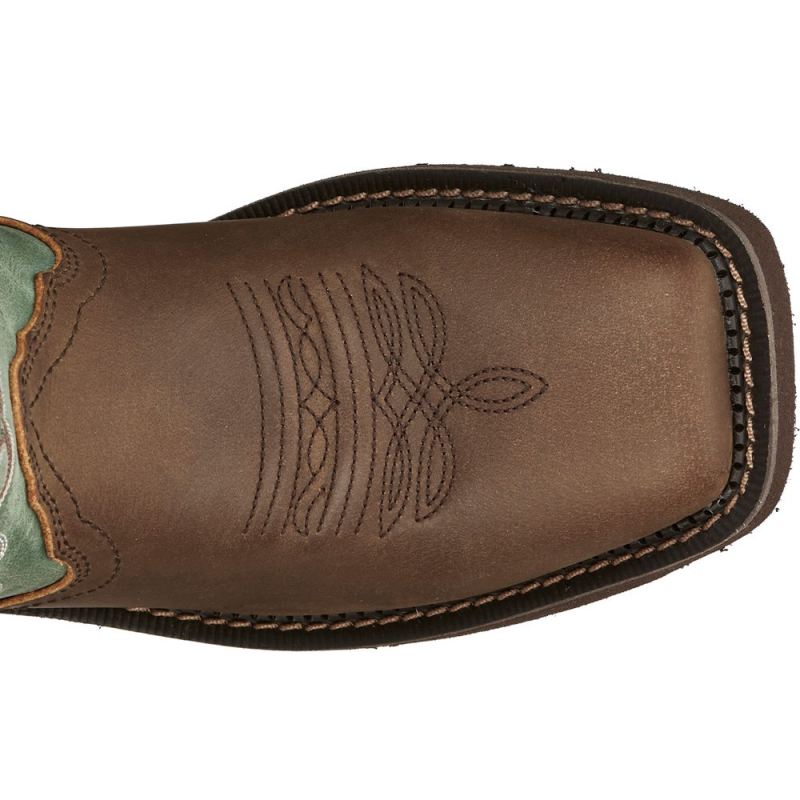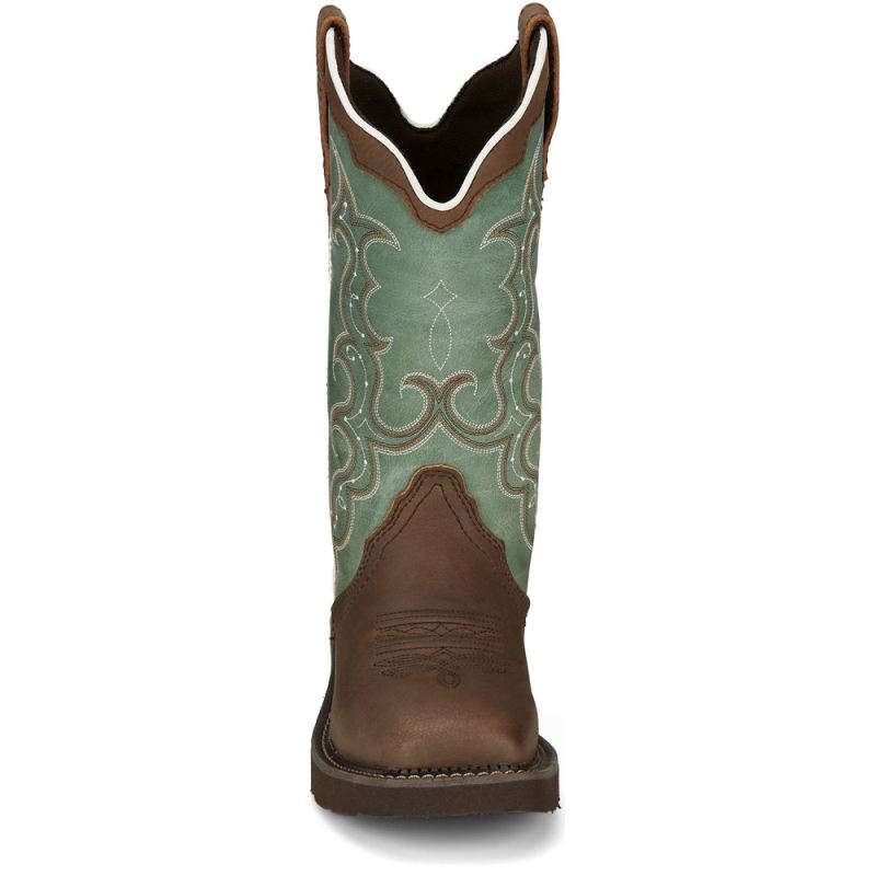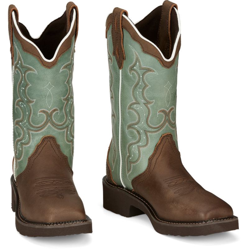 Its teal leather upper is accented by a delicate white and gold stitch pattern and features a scalloped collar for a feminine touch. The distressed golden brown foot gives this boot a vintage feel and sports a square toe. The J-Flex Flexible Comfort System" insole with removable orthotic inserts guarantees lasting comfort for the free spirit ready to run wild.