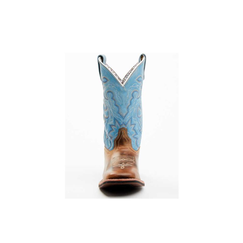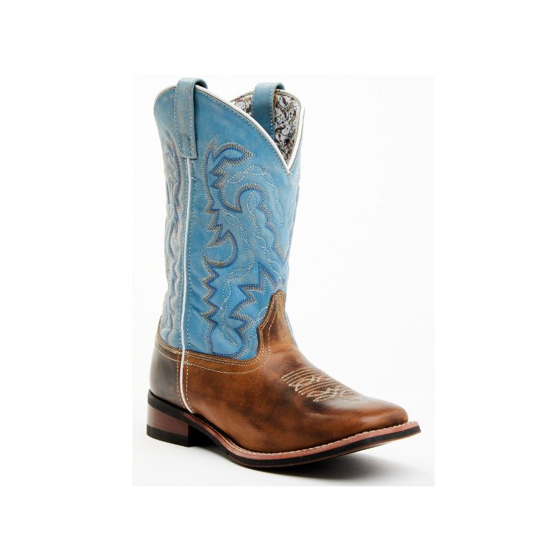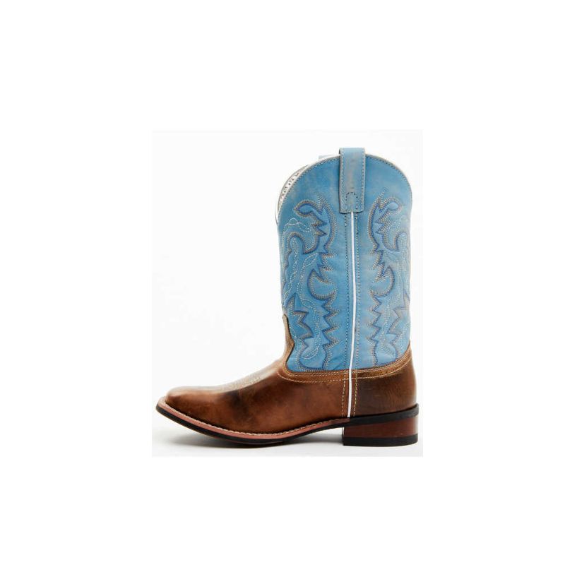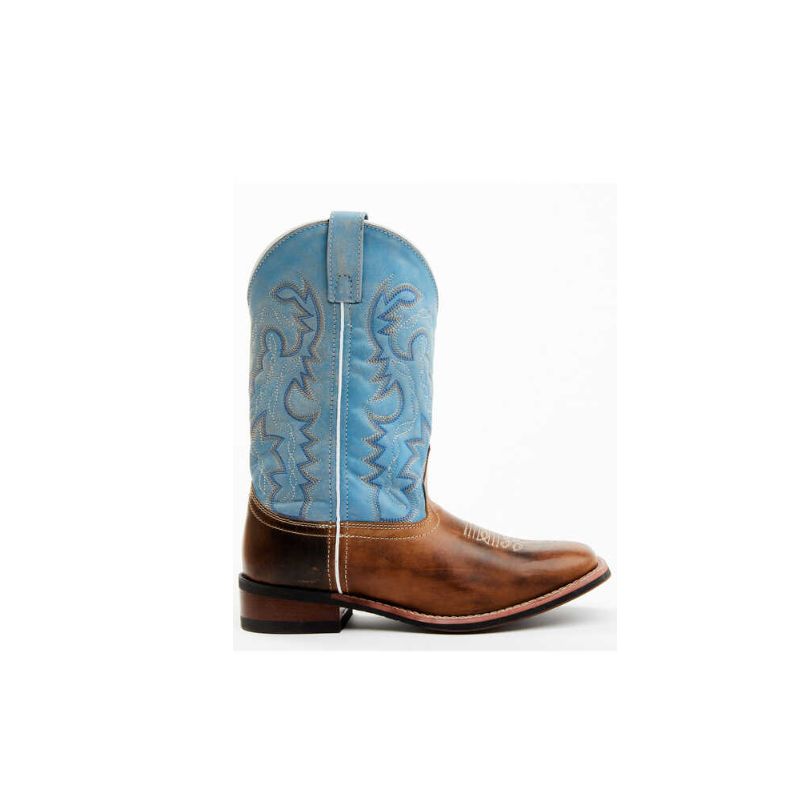 Brown burnished leather vamp with light blue shaft with western embroidery and white piping