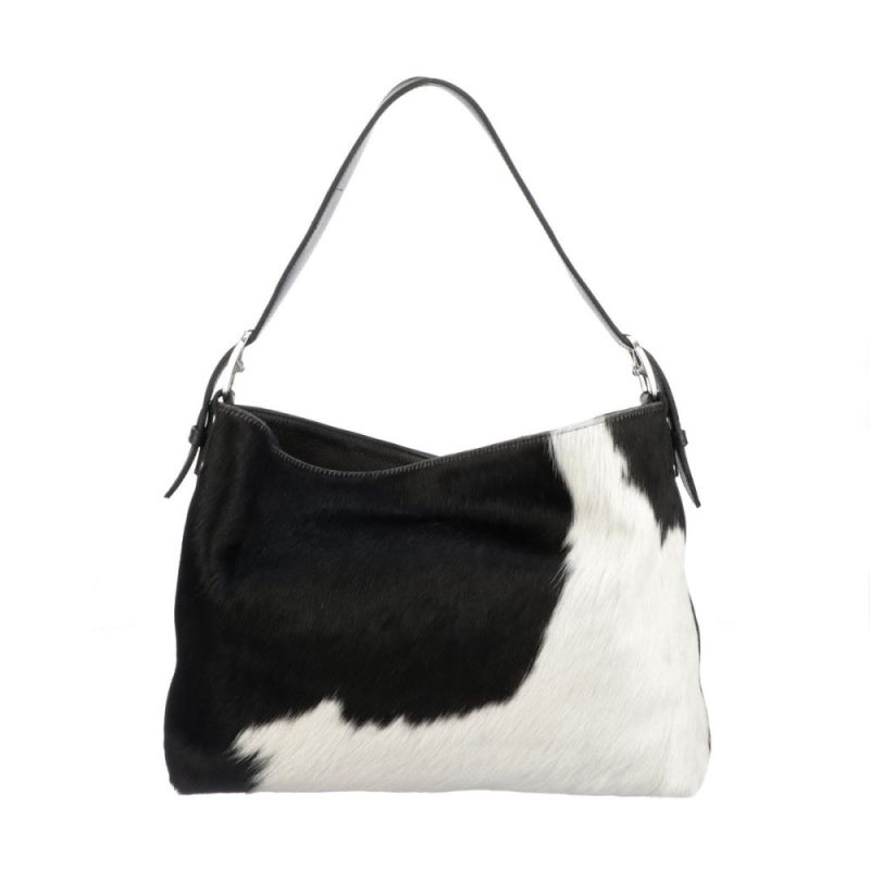 In dramatic black and white, the Cowprint Hobo Bag is handcrafted from the finest Italian leather and soft hair-on cowhide. A shoulder bag with style, it's got a slip pocket and a zippered pocket on the inside. It's roomy enough for your wallet, sunglasses, phone, notepad, scarf, and a whole lot more.