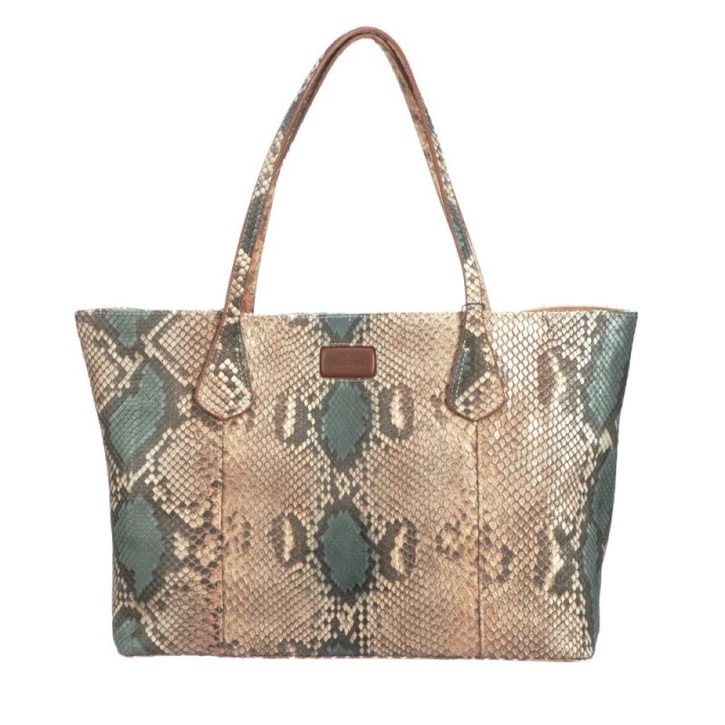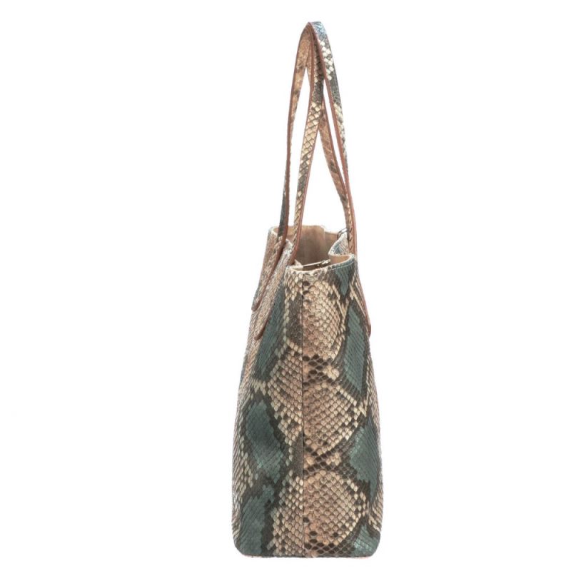 Made from genuine python, this tote is perfect for a special night out or everyday use. A black suede lining protects everything inside, and a special pocket keeps smaller things, such as your phone, safe and secure. This tote gets the job done and makes a bold statement doing it. Genuine python exterior with suede interior lining. Imported. 18" W x 11" H x 5" D 9" strap Imported