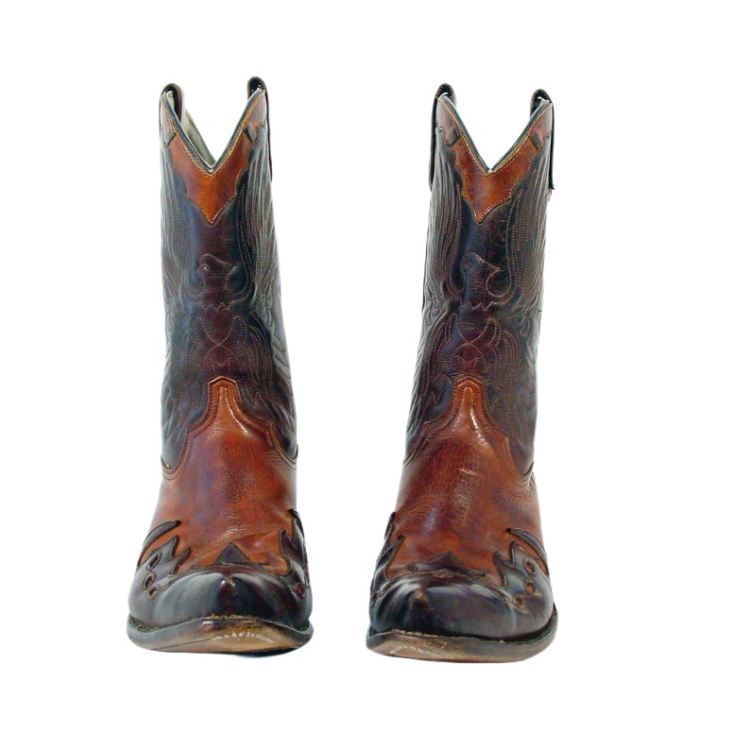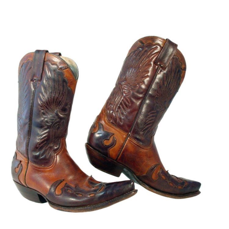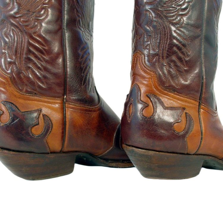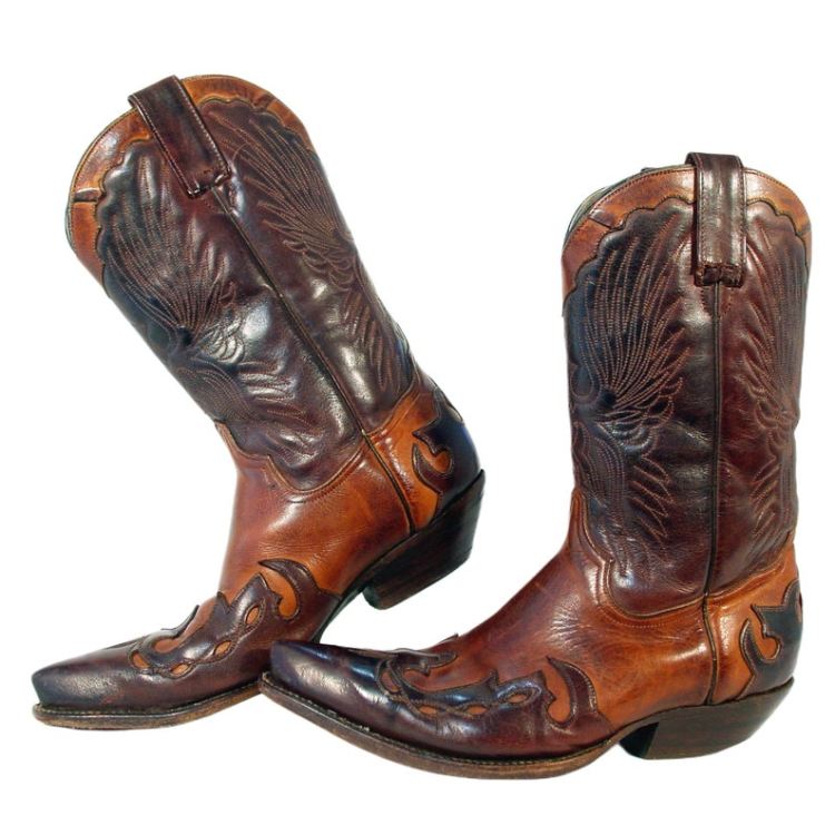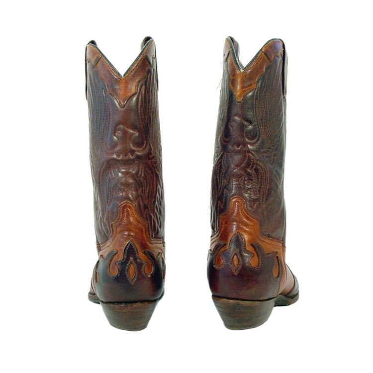 From the 80's, these handsome two-tone cowboy boots are full of detail and top-grade quality construction. This kind of boot only gets better with age. Leather lined, stitched-thru design shows wings front and back and flames around the bottom. Made in Mexico.