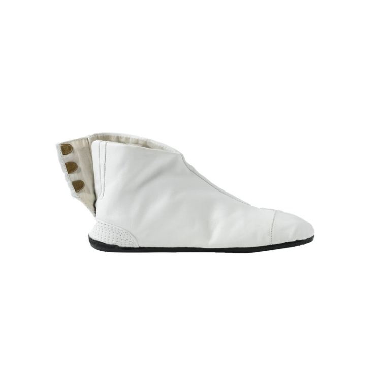 Genuine leather and silk, cotton lining, stitched and glued rubber sole. Closure at the back of the ankle with 12 Kohaze hooks. Height: 31 cm.