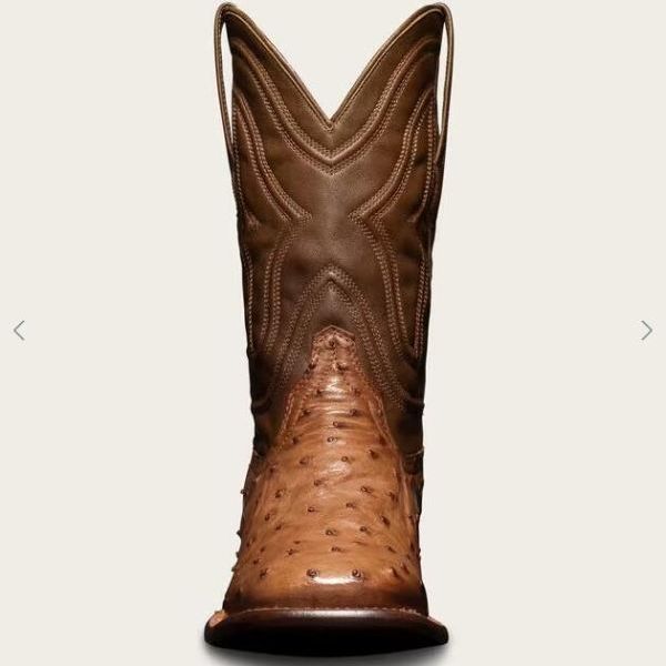 Our broad square toe boot in full-quill ostrich stuns. Features a two-tone shaft and vamp, double stitched welt, 1 " straight heel, and a 12" shaft with a new Tecovas original cording pattern. It's a classic square toe boot in our most popular exotic hide. The Emmitt is made for special occasions with an edge that is pure cowboy.